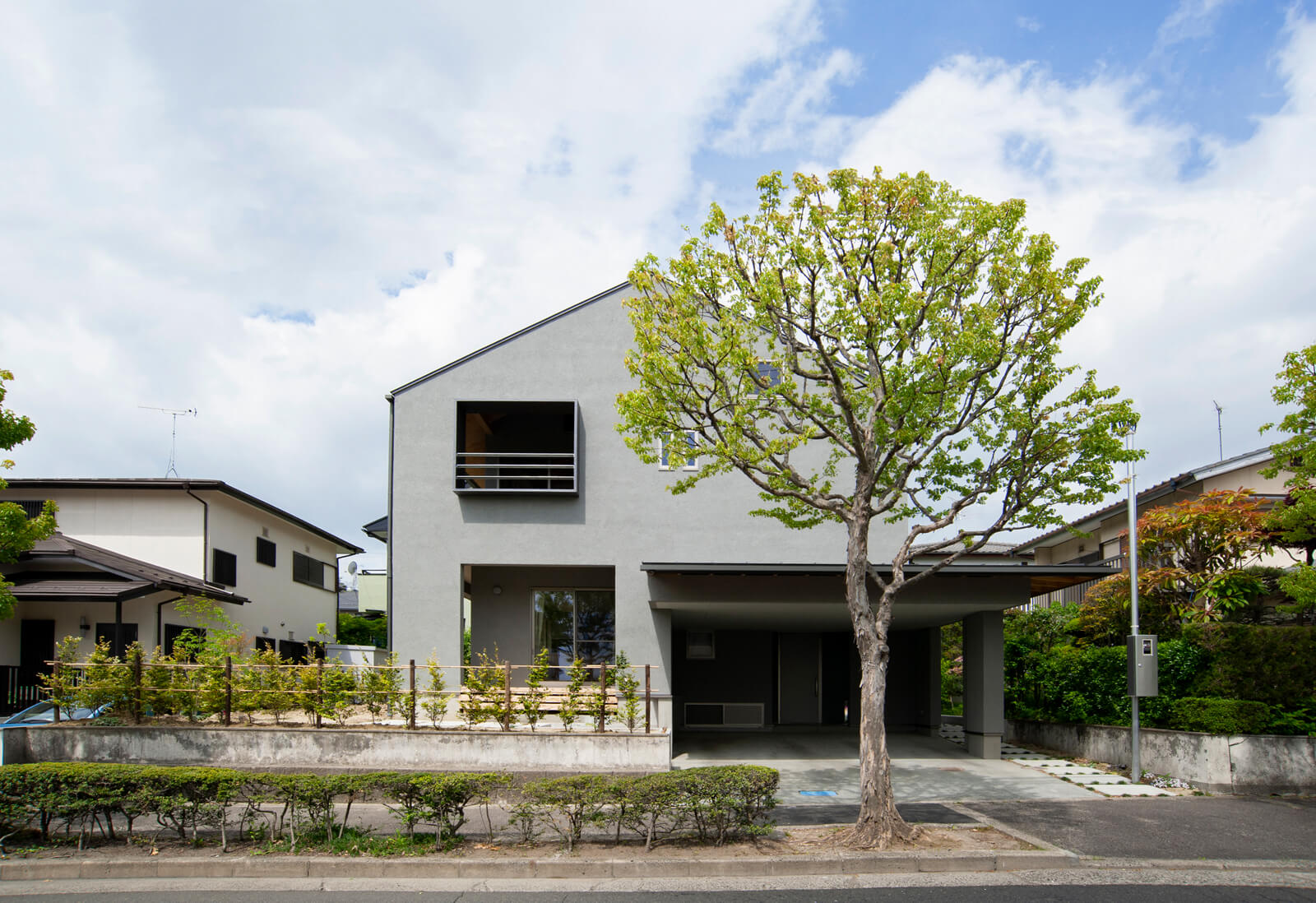 街路樹の緑が豊かな古い住宅地に建つ、30代の3人家族のための住宅です。敷地は、冬に街路樹の葉が落ちると仙台市街が見える高台にあり、東側の前面道路はバス道路で車や人通りが比較的多く、敷地は歩道を介して約1m高くなっています。