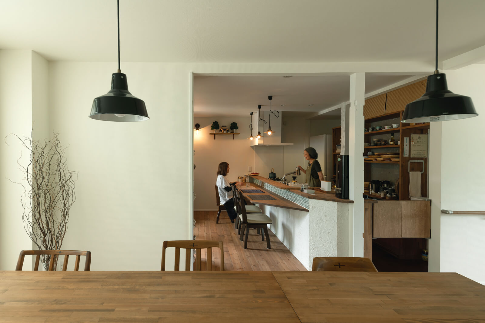 住まいと店舗は入口を分け、これまで和室として使用していた場所にキッチンカウンターを配置。台所があったという北側には、新たに大きな窓を設け、緑を眺めながらくつろげるカウンター席をつくりました。