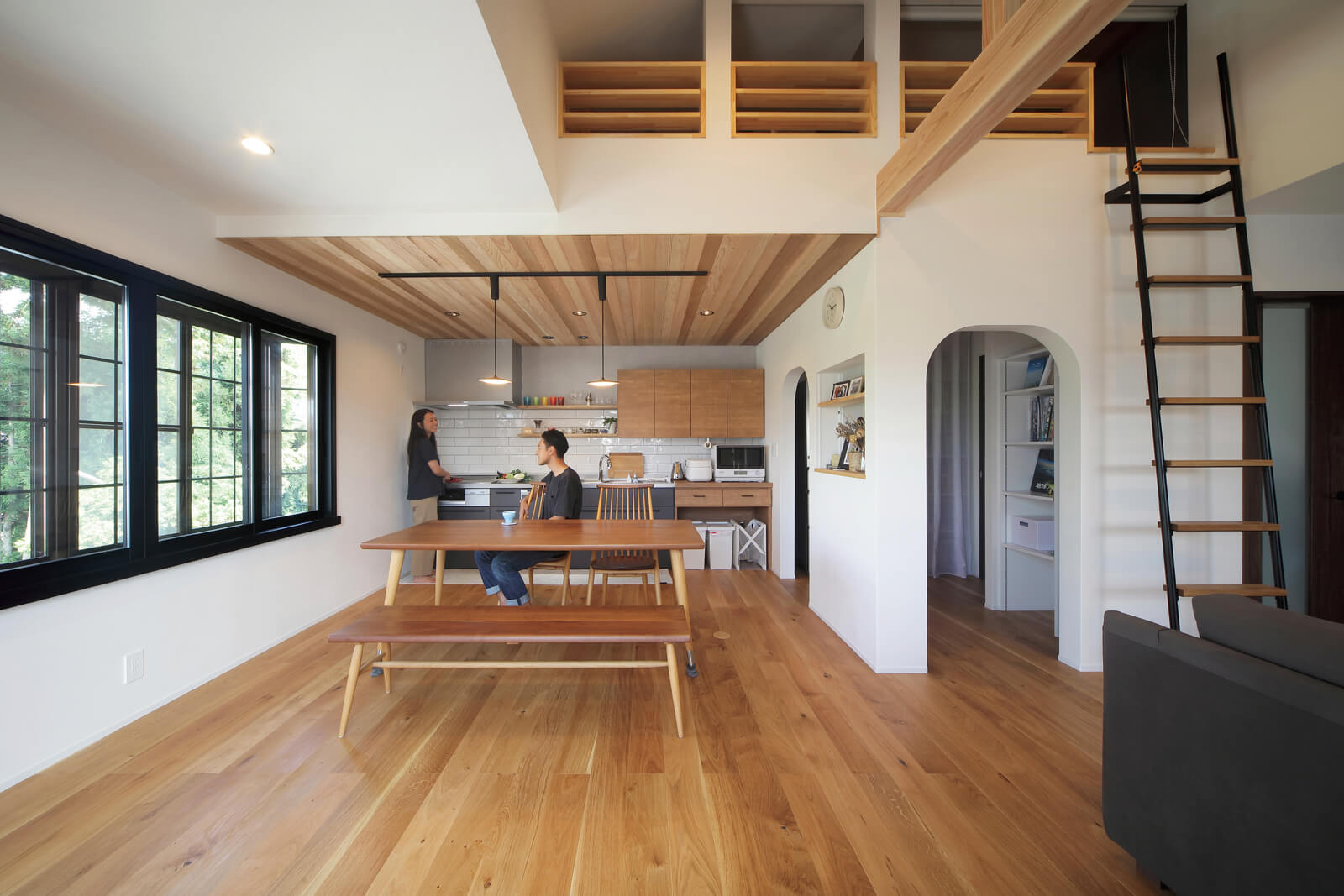 壁面に棚をつくり付けた籠もり感のあるロフトは、「思っていたより広いスペースを確保できた」とEさんも満足の様子。ご家族が自然体でいられる飽きのこないデザインを意識した空間は、シンプルさのなかに落ち着きが感じられます。
