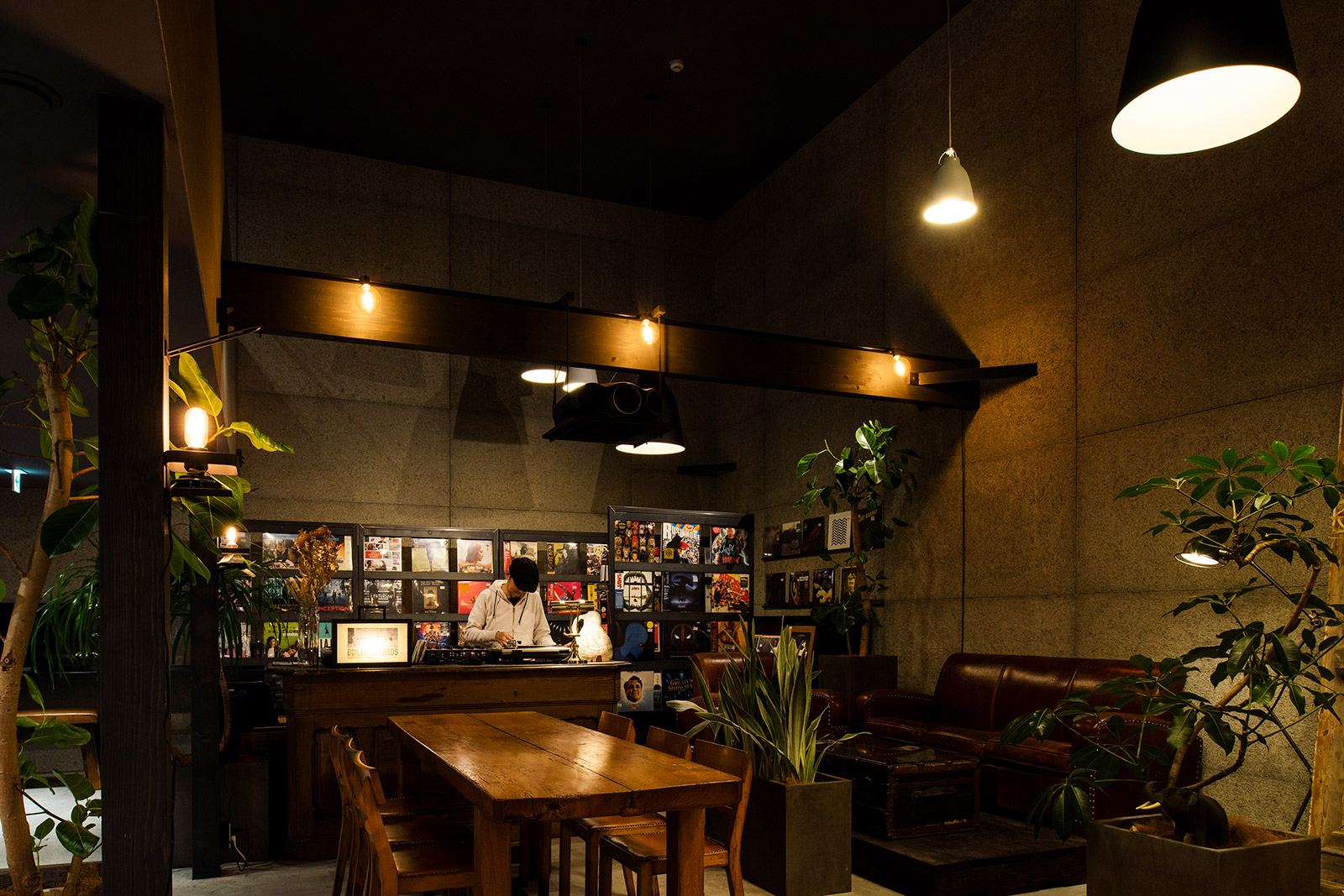 店名の「boiler」は“ライブの熱がこもった空間”ボイラールームが由来。音楽好きなオーナーは、店内に2ヵ所のDJブースも設け、壁には音響効果に優れた木毛板を採用。 また、若い頃に日参した洋楽輸入盤のお店の雰囲気を、カフェのエッセンスに採り入れたいと、アメリカからアナログ盤を自ら取り寄せ、店内で販売しています。額縁型の造作アイアン収納棚に収められたカラフルで個性的な紙ジャケットは、シンプルな空間のアクセントになっています。