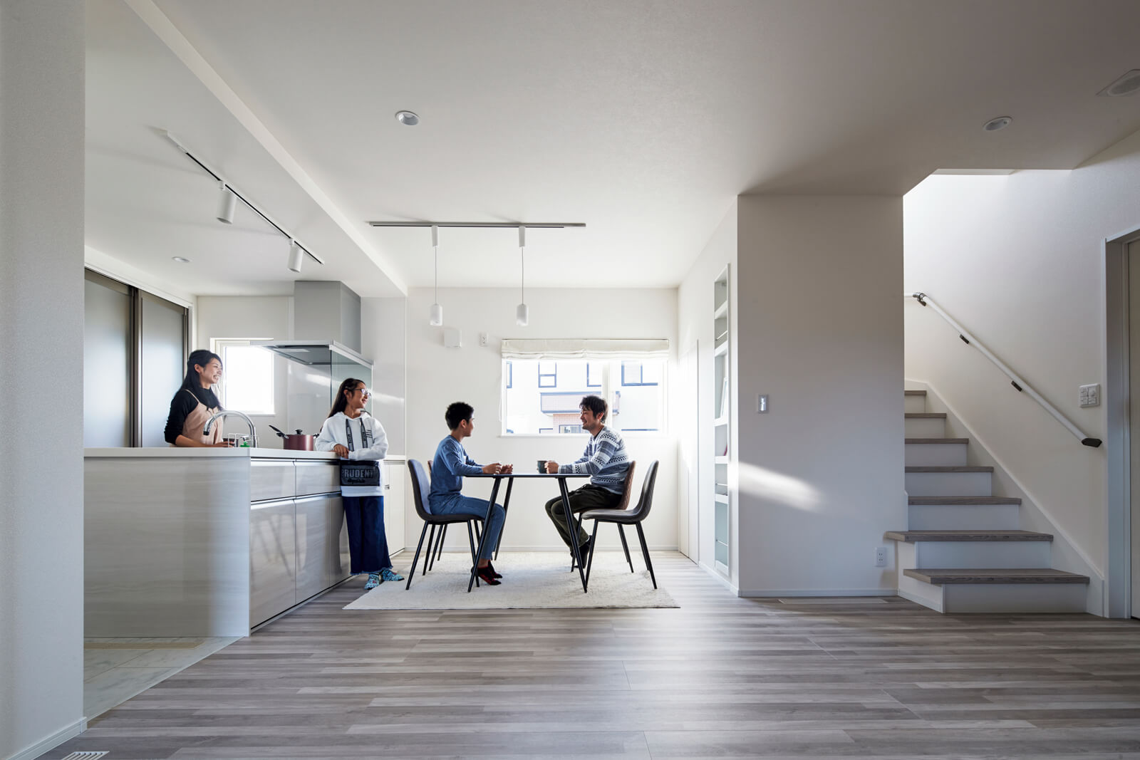 陸奥湾に面した平内町に建つMさんご一家の新居は、すっきりとした外観が印象的。ご夫妻と双子のお子さんの4人家族が笑顔いっぱいに暮らしています。