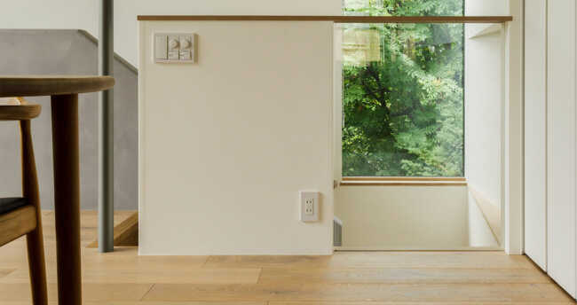 スキーインストラクターの経験もある建築家が自邸を建てたのは、里山の傾斜のある林の中でした。レンガを敷き詰めたポーチを進んで玄関ドアを開けると、まっすぐに伸びる玄関土間。この土間は、居住空間とアトリエを緩やかに分けながら、リビングの前までつながっています。薪ストーブの背後には大きな窓があり、リビング・ダイニングから周囲に広がる林を一望できます。レンガ敷きの土間は、コンクリートやタイルのそれとはまた異なる柔らかな趣が感じられますね。