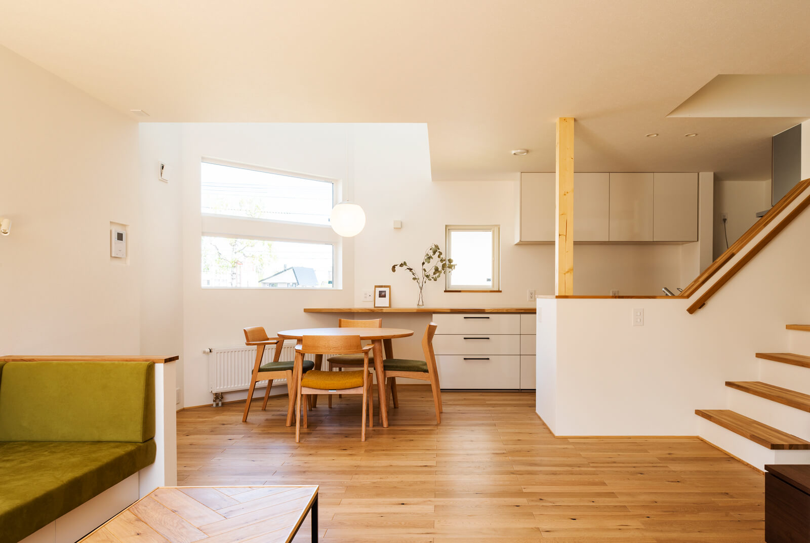 『西野の常春Ⅱ』では、天候や季節に左右される南からの光よりも、1年中安定した明るさを確保することができる北側に、家族が集うダイニングを配置。上下に設けた2つの窓からやわらかな光が入り込み、夜は星空が見える豊かな空間としました。そして、土地特有の風向きを把握して、窓の大きさや配置、サッシの開閉方向、住まいの間取りを設定。玄関とダイニングに2つの吹き抜けを設けて風の通り道を確保。上下階を新鮮な風が抜けていきます。