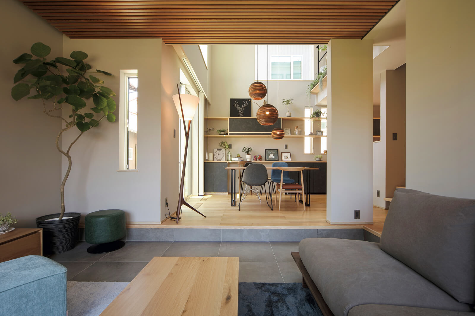 「自然素材とともに美しく年を重ねる暮らし」というコンセプトどおり、家族の成長とともに自然素材の経年美を堪能できる住まい。自然素材が織りなすシンプルで大人かっこいい雰囲気は、長年住んでも飽きのこない上質感に満ちています。室内は間仕切りを極力減らしているのもポイントで、家族の動きが感じられる風通しの良さに加え、家族のライフスタイルの変化に柔軟に対応できるのも魅力。ほかにも開放的な吹き抜け、たまり感が心地よいピットリビング、使い勝手の良いオリジナルキッチン、夜に映える照明計画など見どころは多彩です。