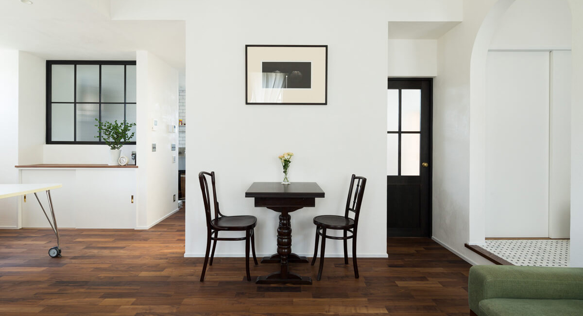 広いLDKの空間にメリハリを持たせるため、天井の一部に暗い色の壁紙を張る、または木質パネルであえて重さを感じさせる演出をするなどして、変化をつけるのも一考です。「色の軽重感」を上手に取り入れて心地よい空間をコーディネートしましょう。