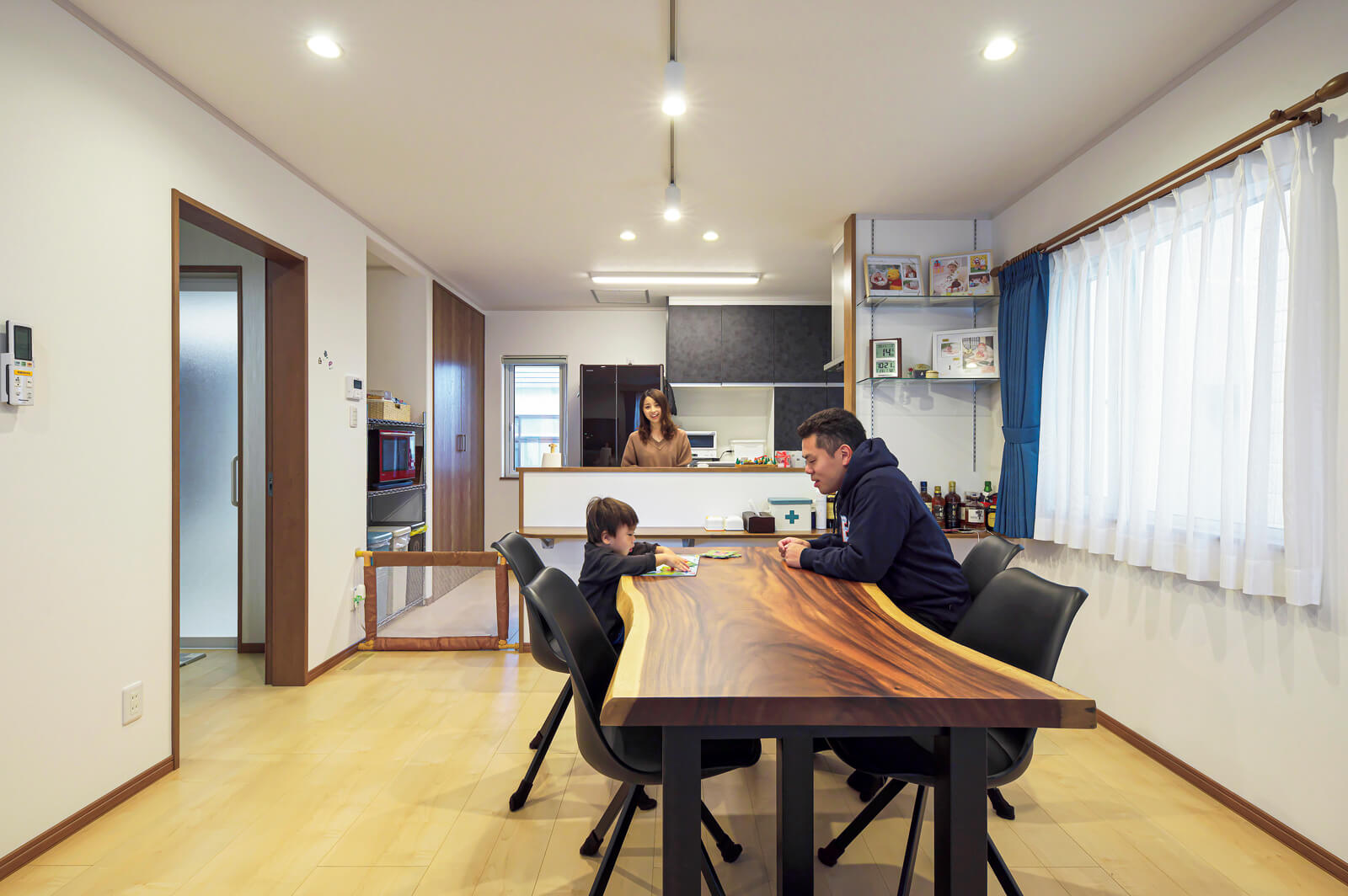 念願の26帖のリビングのある新居が2020年6月に完成。「夏は仕事から帰って玄関のドアを開けた瞬間に涼しくて感激しました。寒くなってからも、1階はすべて床暖房で暖かいので、息子はずっと裸足です」と奥さん。「この広さでも暑くも寒くもないし、夏は太陽光発電がつくり出す電気のほうが消費より多かったくらい。冬も夜間電力で少し暖めておけば、日中は低めの温度設定でも十分暖かさがキープできそうです」とTさん。