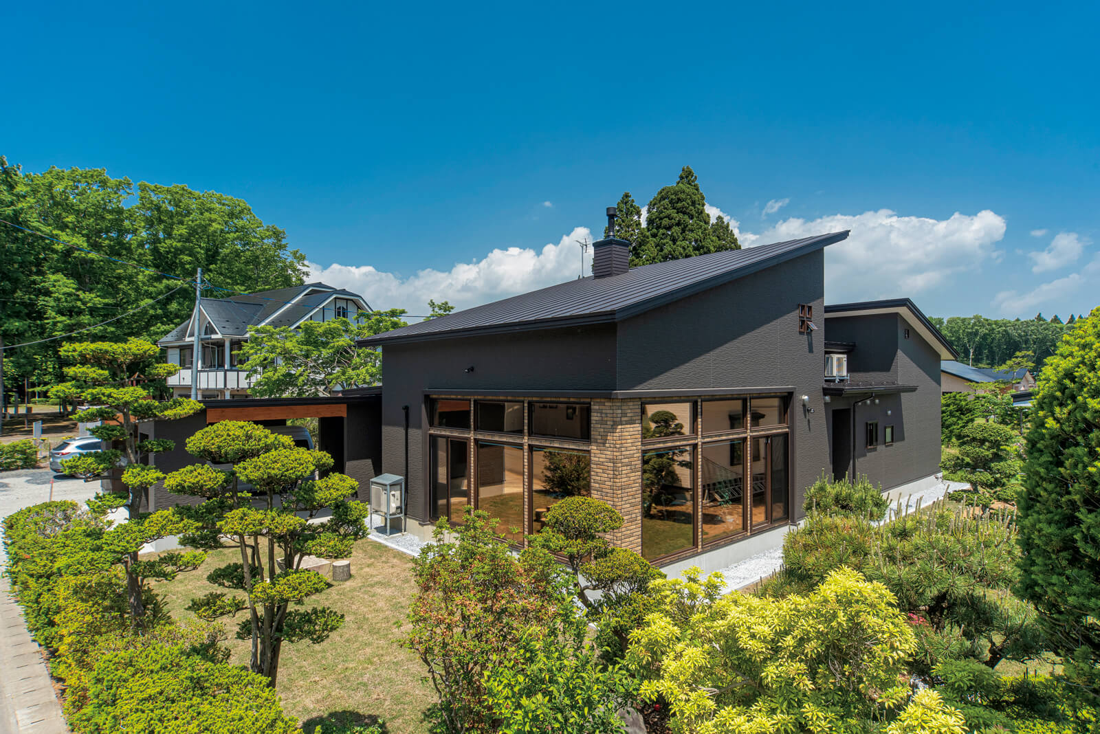 建築地はSさんのお母さんが住む実家と同敷地内だったため、設計はまず実家との調和を図ることからスタート。外観デザインについては、落ち着いたトーンのモダンスタイルを採用しました。また、既存の庭の植栽を借景として活かせるよう窓は大開口とし、南面道路側の欄間窓にはあえてカーテンを付けず、照明に浮かび上がる丸太を周囲から楽しめるようにしたのもこの家ならではのポイントです。
