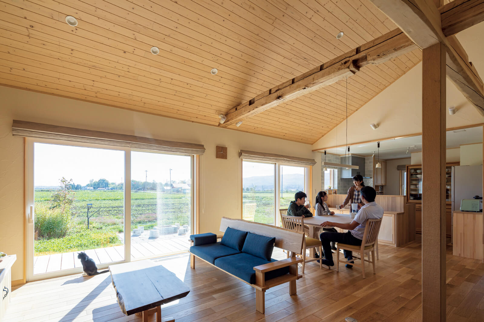 山、空、草木が見える暮らしを希望したSさんが気に入ったのは、木造の母屋と納屋が建つ土地で、2棟とも築年数は相当なもの。中でも特に心を打ったのが、納屋の構造材として使われていた9mにも及ぶシウリザクラという広葉樹でした。「家具材や合板に使うのが主流の広葉樹を、構造材として使っていることに感動し、この素晴らしい古材を生かす技術のある会社を大前提に依頼先を探しました」。