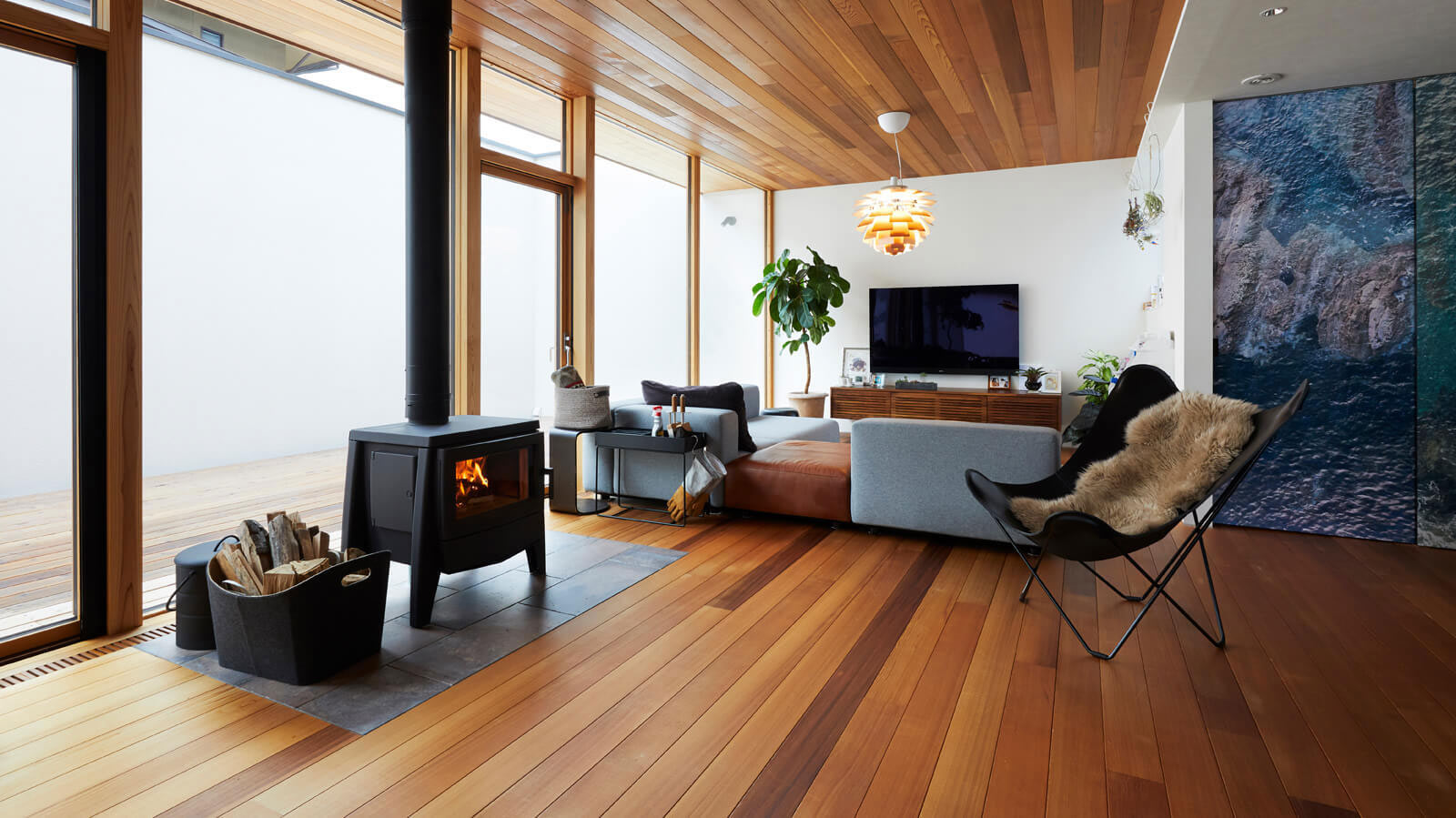 床と天井にあしらったレッドシダーが上質感と落ち着きを醸すLDK。その南面には陽射しをたっぷりと採り込む壁一面の大開口。プライベートコートに出入りできる2つの掃き出し窓を左右に従えるように、Aさん宅の薪ストーブは窓辺で存在感を放っています。