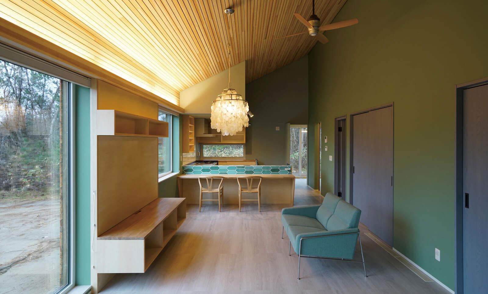 「マカロンのような配色」という希望を受け、屋根やLDKと和室の内装の色はパステルグリーンに仕上げました。内装のグリーンは微妙にトーンの異なる4種類を使い分けて、空間が立体的に見えるよう工夫。また、LDKは4m以上の高さの勾配天井をスギ柾目板で仕上げ、空間がより大きく感じられるようにしています。