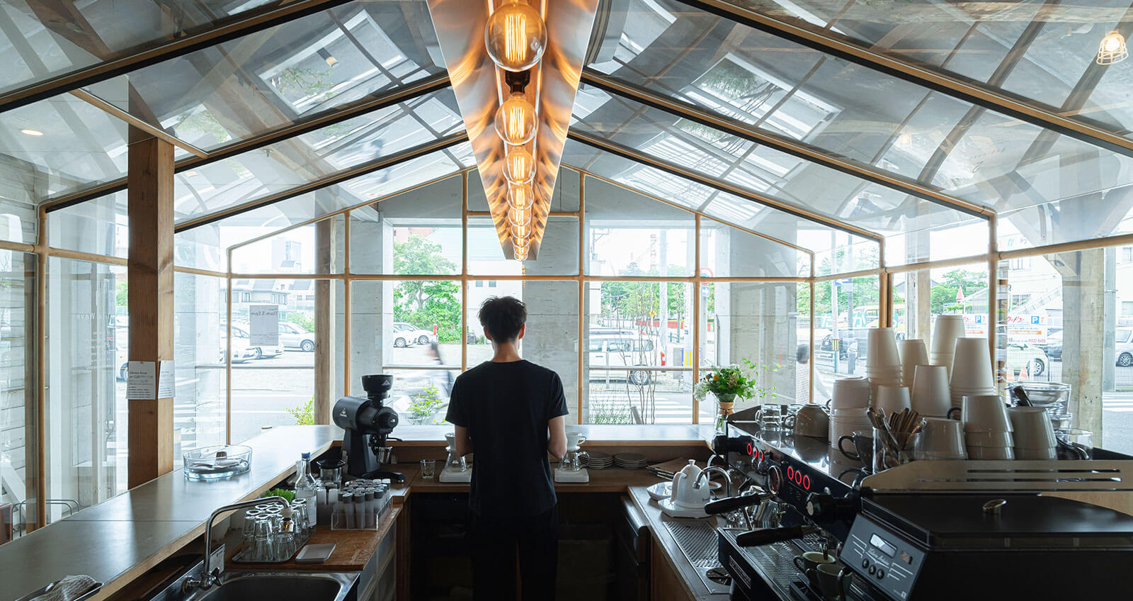 1階部分の壁をなくしてガラス張りの小屋を建てるというのが、安齋さんからの提案でした。農作物を想起させるビニールハウスで、コーヒーという自然の恵みを味わう。そのようなイメージでデザインされた空間です。