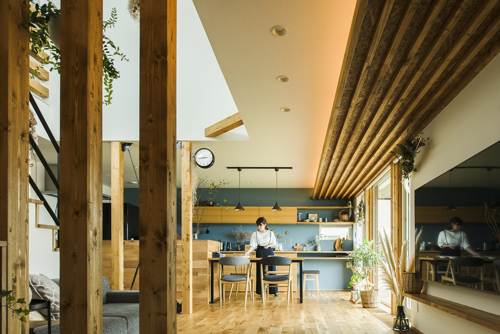 対面式キッチンの背面には、奥さんが選んだブルーグレーのアクセントウォールに、ナラ集成材を用いた造作収納が設えられ、開放的な空間のアクセントになりました。効率の良い動線や充実した収納計画が、共働きのご夫妻の家事と子育てをバックアップ。「収納量がたっぷりで、どう収納していいか悩むくらいです。統一感ある内装デザインも、イメージどおりです」と、奥さんは満足そうに語ります。