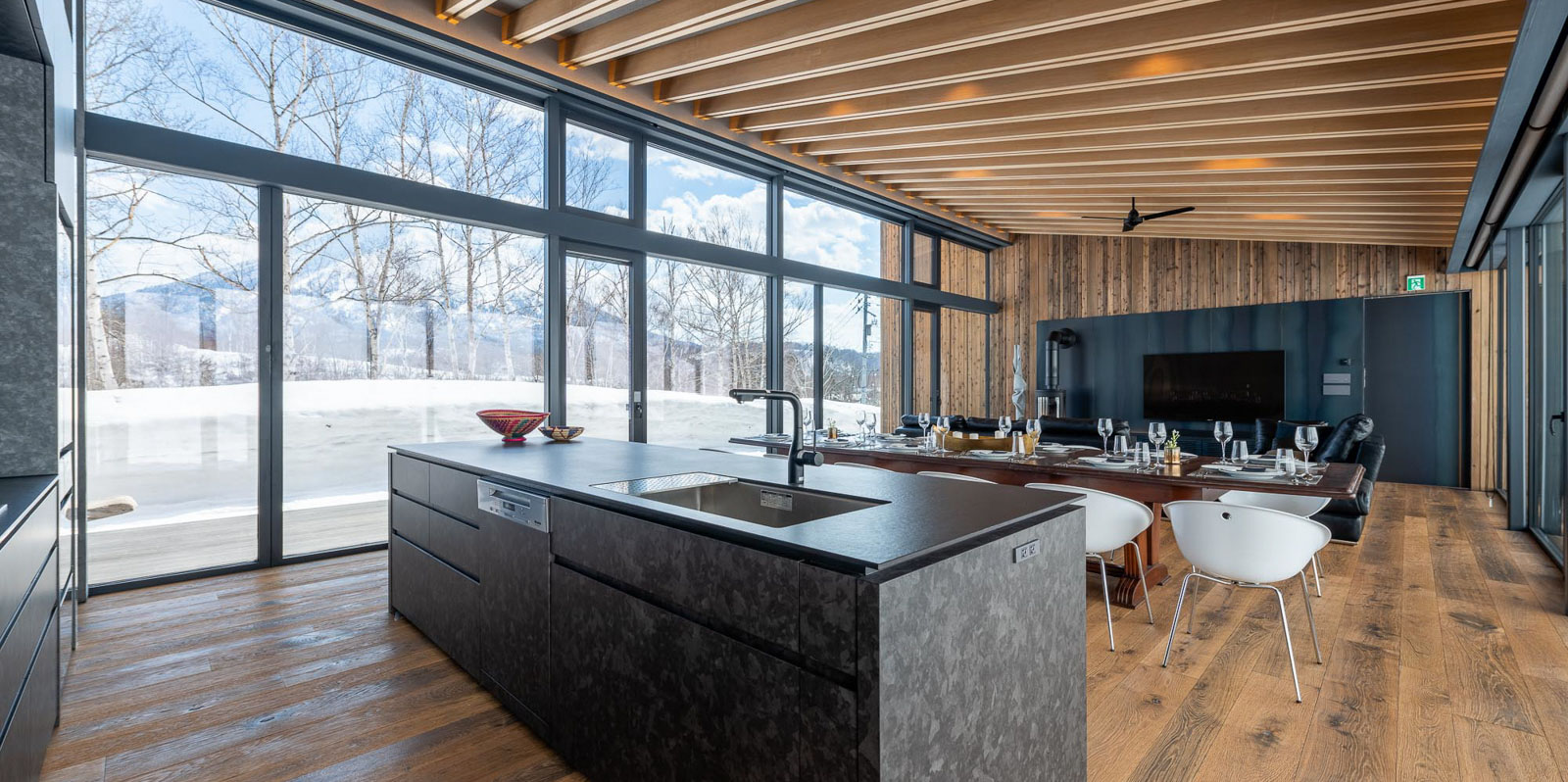 1つめは「飛翼」。スタイリッシュでモダンなデザインの中に、日本伝統建築の手法や素材を組み合わせた和モダンスタイルです。なかでも2階にあるウチからソトへつながる景色を重視した、ガラス張りのLDKは圧巻。1階には広いギアルームを設け、スキーやスノーボードからそのまま室内へ入ることができる動線になっているのがニセコならではです。