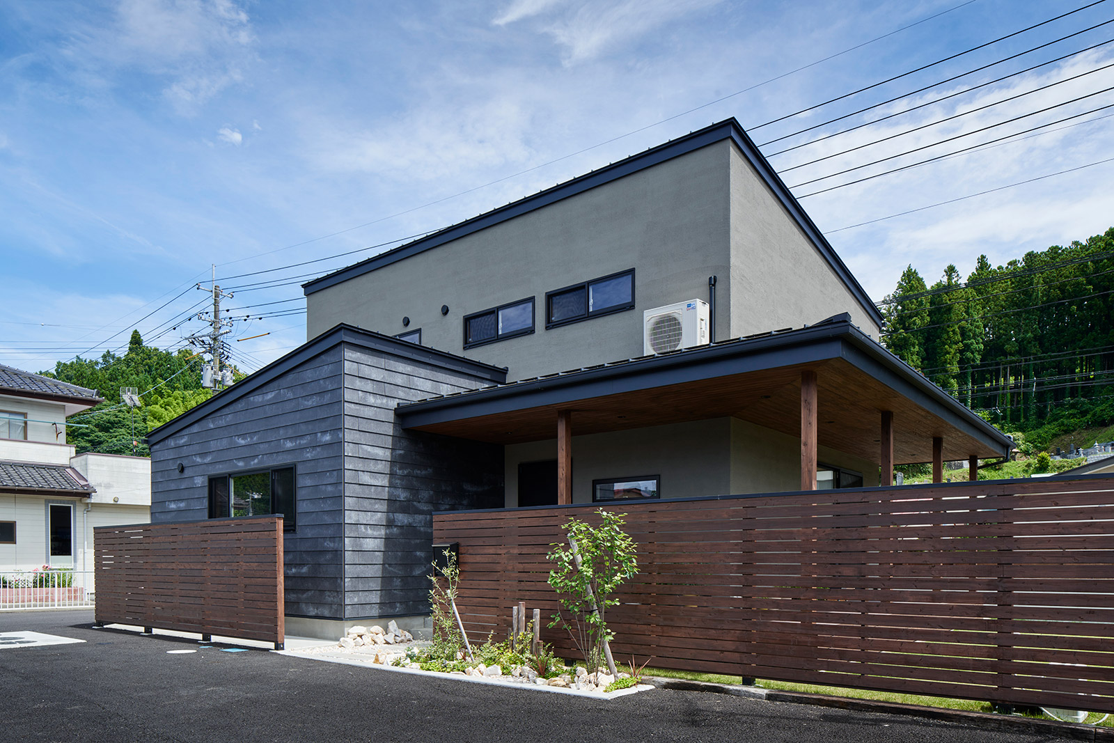 「カフェみたいな感じに、と漠然とお願いしたのですが、イメージどおりの仕上がりでした」と奥さんが語る外観は、グレーの外壁と木塀、そして直線的なフォルムが都会的で洗練された趣を醸し出しています。