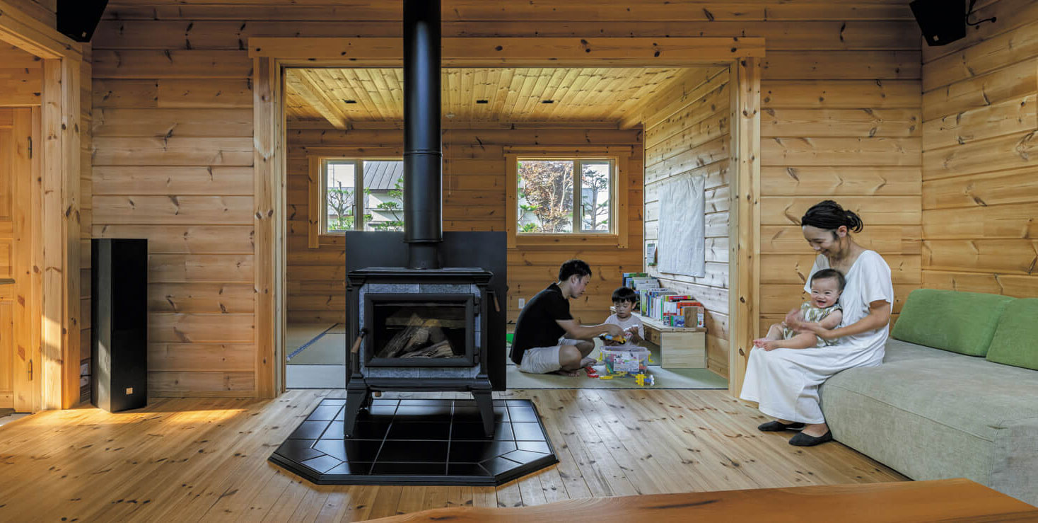 住まいとして思い描いていたのは、薪火を囲みながら楽しい時間を過ごせる開放的な暮らしの空間です。2階の天井まで角ログで仕上げた新居のリビングは上部が大きな吹き抜けになっていて、家のほぼ中央に薪ストーブが設置されています。住宅性能の高さも手伝って、これ1台で真冬でも家全体が暖まります。