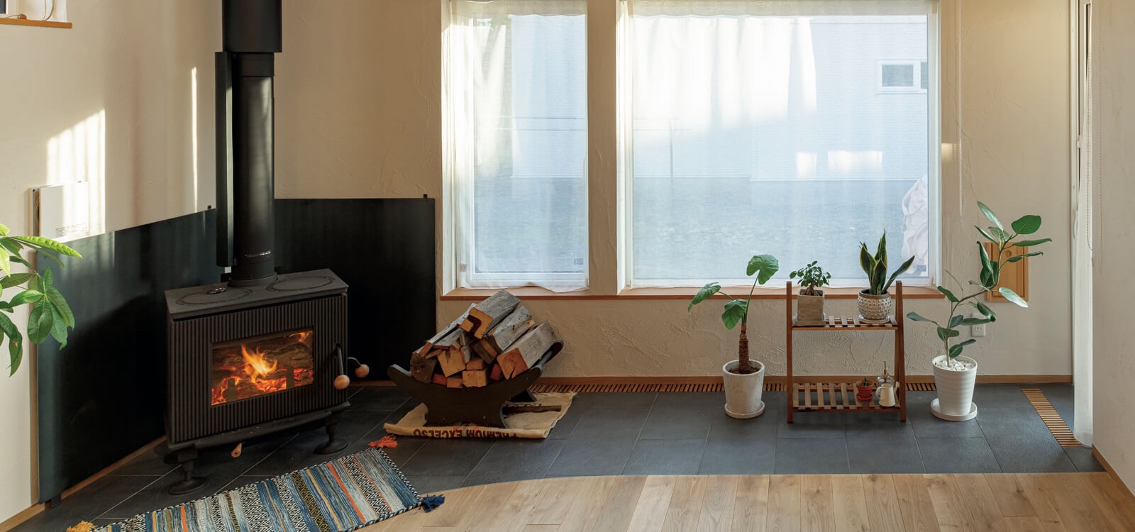 ご夫妻は早速、芦野組に「家族の気配をいつでも感じられる心和む住まいを実現したい」と新築を依頼。芦野組は家づくりの際には、住まい手と何度も打ち合わせを重ね、歳月とともに変化していく暮らし方まで見通したプランを提案しています。Aさんの新築に際しては、子育て後の暮らしを考えて1階のみで生活できる平屋的な間取りに、冬のおうち時間の楽しみとして薪ストーブもプランに加えました。