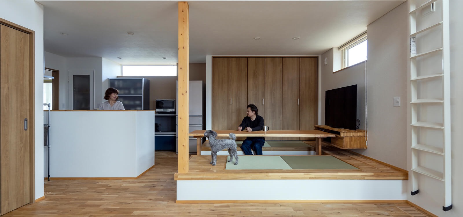 屋根の勾配を生かした4.7mの開放感のある吹き抜けリビング、料理好きの奥さんお気に入りの小料理屋風のキッチン、一枚板のテーブルに合わせて4畳半の小上がり仕様にしたダイニングなど、住み心地のよい空間が実現できたKさん宅。350㎜の絶妙な高さの小上がりは、テーブルを移動し、畳を組み替えると和室にもなります。