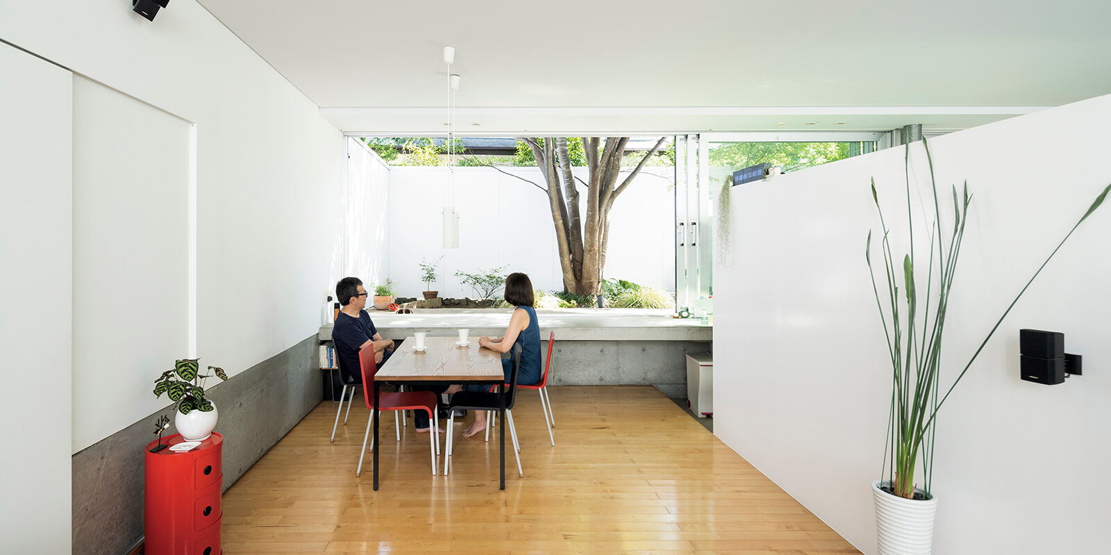 変わったこと|外壁を兼ねたシンプルな白い塀の中に、路地の延長を意識した黒いトンネル状の「エントランススペース」、庭を楽しめる半地下の「居室スペース」、家の中央に集約した「収納コア」という3つのパートがデザインされました。11年を経てアイレベルにある庭の樹木は大きく生長し、「箱庭や盆栽の中に住んでいるような生活」を実現させています。
