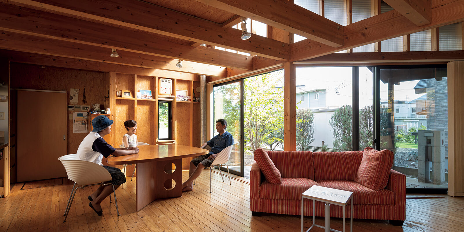 建築家と自由な発想で家を建てて16年(取材時)。当時7歳だった息子さんは24歳に。どこにいても家族の気配を感じるひとつながりの間取りで、今も家族3人が仲良く暮らす青森の住まいを訪ねました。