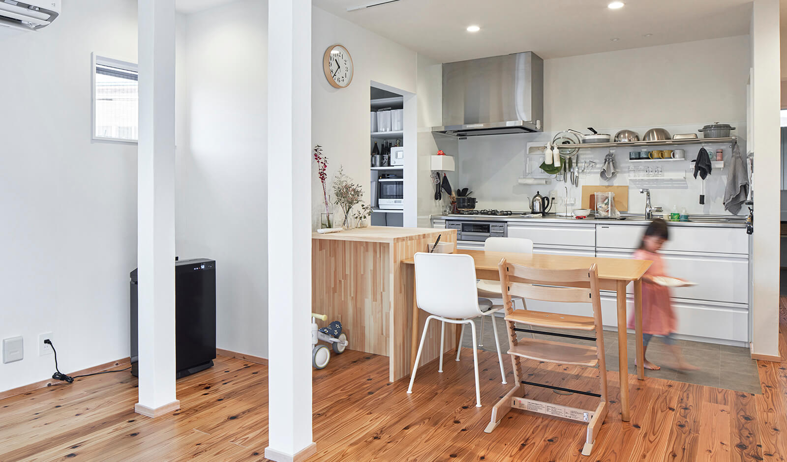 Sさん宅は、築35年の中古物件を購入し、リノベーションした住まいです。真新しい新築の家が好みではなかったというご夫妻。地域に密着しながら中古リノベを扱う増子建築工業を知り、興味を持ったそうです。「一番の決め手になったのは、モデルハウスを見学した際、娘の反応が良かったこと。無垢の床で気持ちよさそうに寝転ぶ姿を見て、増子さんへの依頼を決めました」。