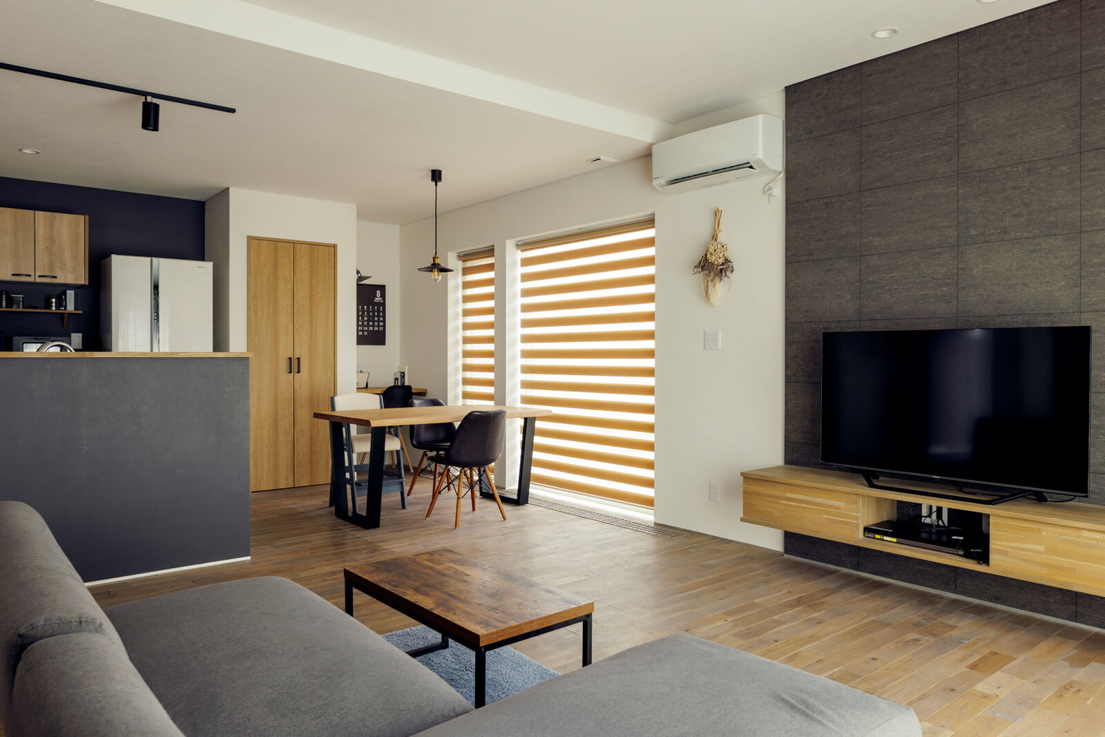 グレーや白を基調に、黒のアイアンなどでインダストリアルな質感を加え、こだわりの無垢フローリングはグレイッシュ仕上げでビンテージ風に。色使いや素材、デザインに統一感のある素敵な空間に仕上がりました。