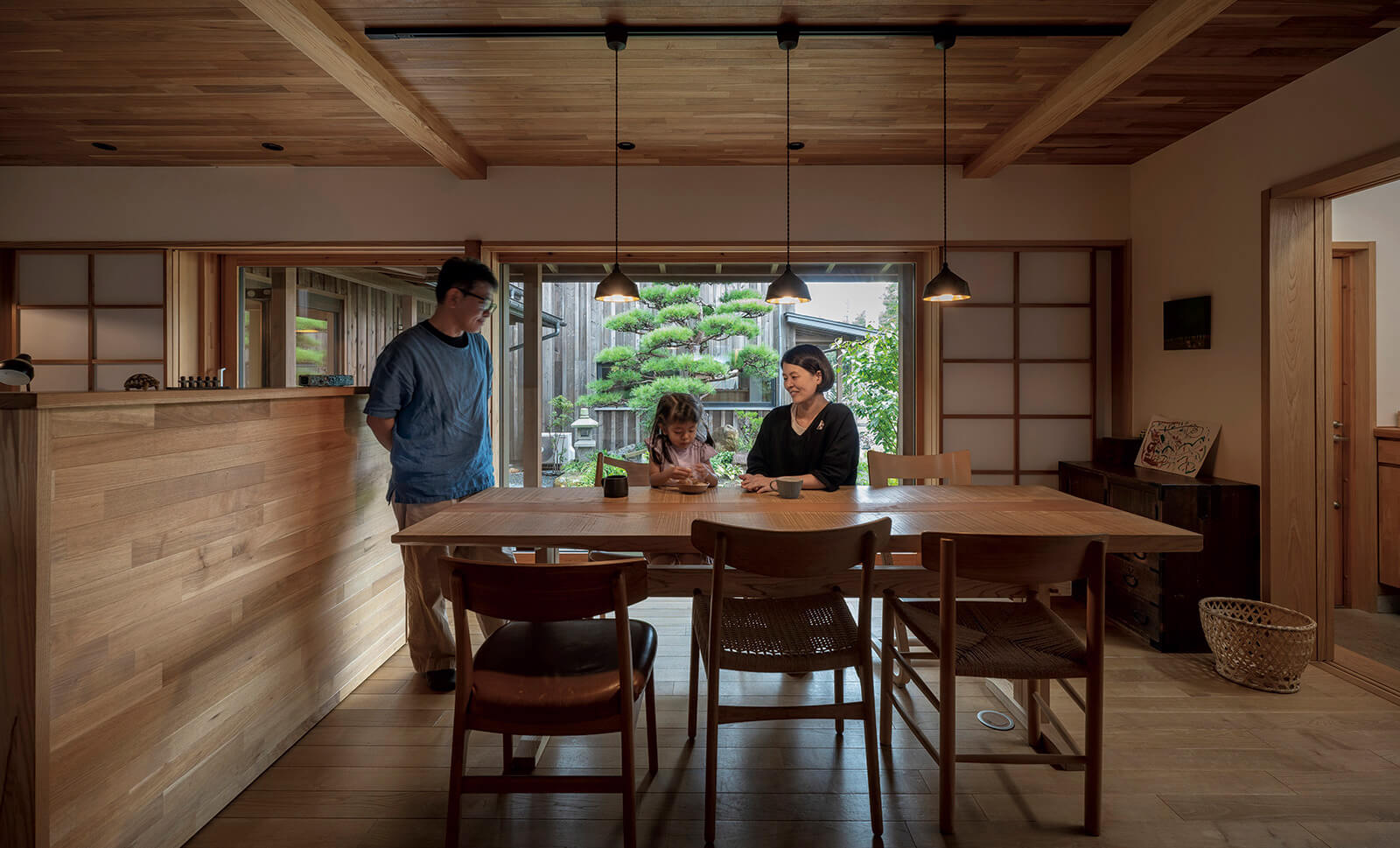 盛岡市を拠点に、地域に根ざした家づくりを行う清水畑建設。同社代表の清水畑貴彦さんは、「自社設計で、地元の木を使い、自社大工の手によって住み継がれる家をつくることをモットーとしています」と話します。盛岡市北部に立つ清水畑さんの自邸はまさにその言葉を体現した一軒。「岩手県産材でつくる気持ちのいい家」をテーマに、断熱性や気密性も高い家を目指して計画されました。