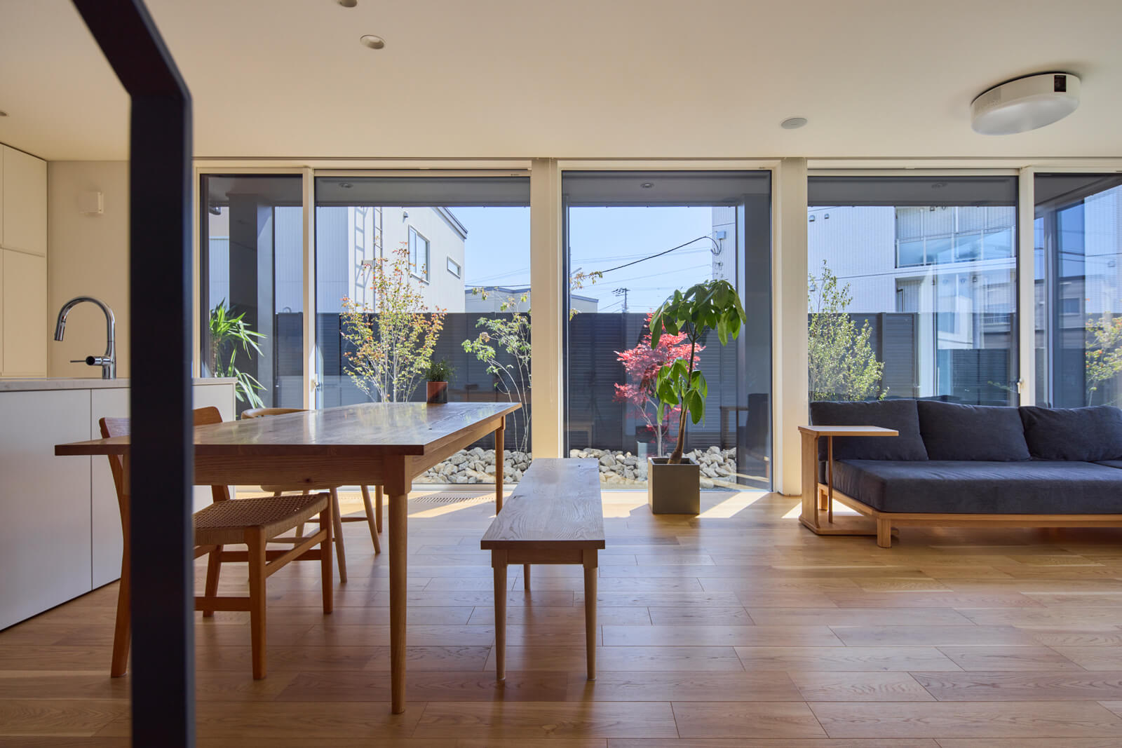 Kさんは「大きい庭がつくれるような広さ」、奥さんは「利便性の良さ」を求めて土地を探していたところ、希望に近い場所が見つかりました。それと並行して、建築会社をいくつも回っていました。その中で出会ったのが、当時公開中だった国木ハウスのモデルハウス。LDKの一面すべてが窓になっている開放的な空間づくりを見て「一目ぼれ」の感覚を味わったという奥さん。
