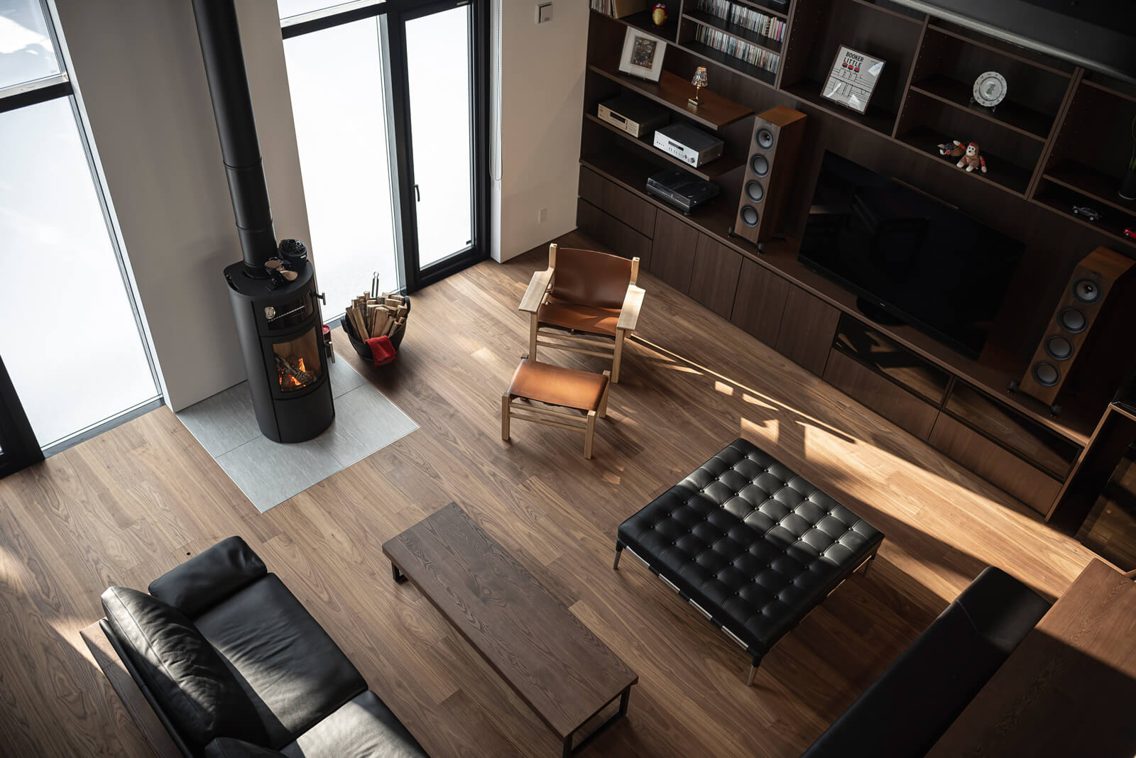 2021年暮れ、ご夫妻の憧れをカタチにした新居が完成しました。天井まで吹き抜けたLDKは、黒とウォールナットを基調にしたシックな雰囲気。Kさんの望みどおり、開放感にあふれたリビング1階にはオーディオやテレビを収めたリビングボード、吹き抜けでつながる2階には造作の本棚が壁一面に設けられ、薪ストーブも設置されています。その光景は、リゾート地のホテルを思わせます。
