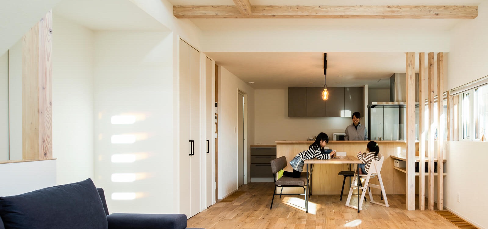 Iさん宅は34坪の比較的コンパクトな住まい。1階に家族が集うLDK、2階は寝室や子ども部屋で構成しています。2階の床面積を確保しながら適切なサイズで設けた吹き抜けや、上下階に一体感を与える中2階など、視界や空間の抜けを利用して面積以上の広がりを感じるプランに。住宅街ではありますが、周囲の視線を避けた適所の窓配置で室内はいつも明るい光に包まれているなど、当社の家づくりの魅力を存分に発揮した住まいです。