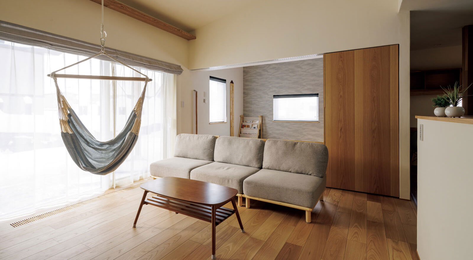 2022年11月に新居が完成。Kさんは家に入った瞬間に、自然な空気感に驚いたといいます。無垢の木をふんだんに用いた塗り壁仕上げの内装はキクザワの提案。シンプルなデザインが、自然素材ならではの温かみを引き立てます。