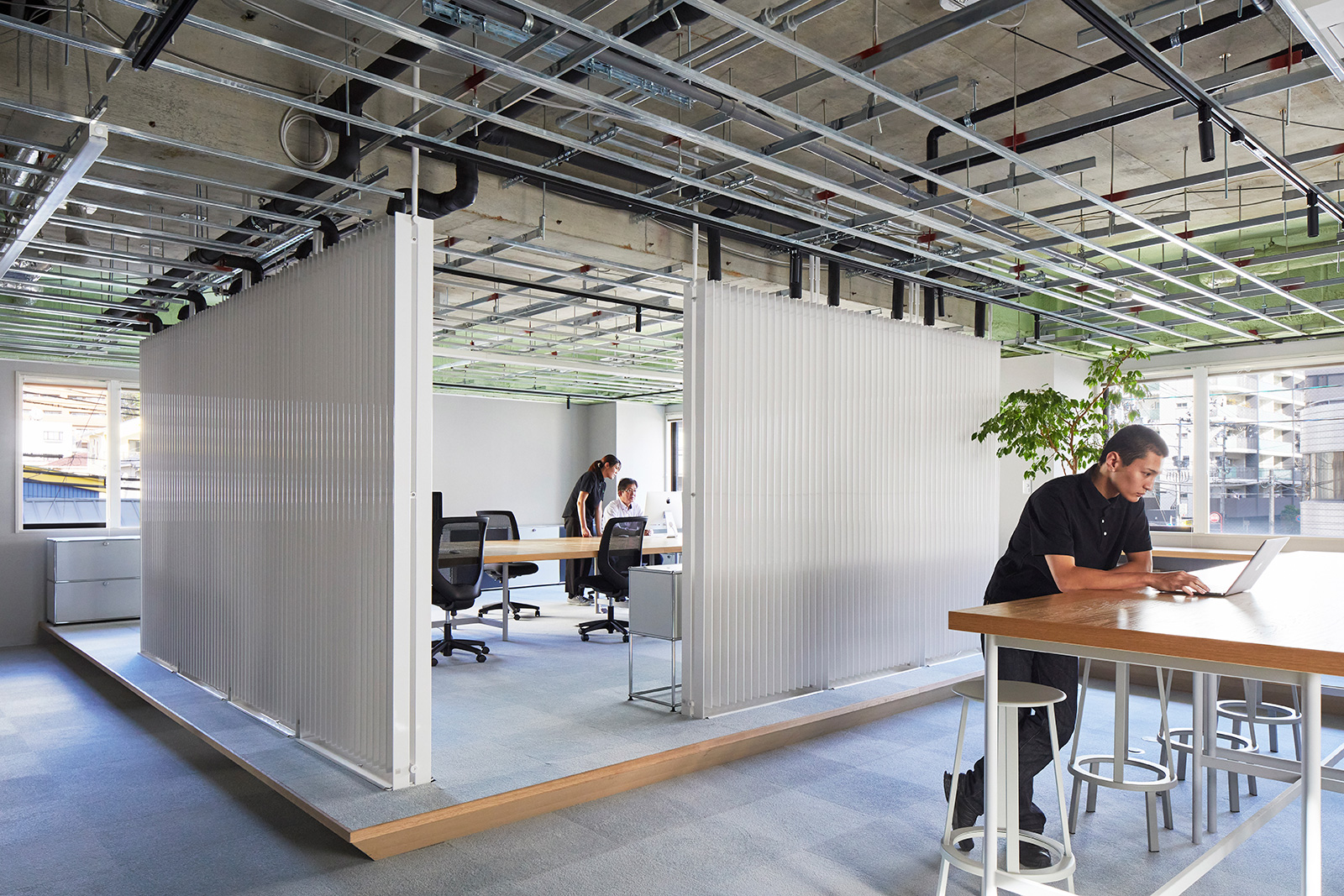 新オフィスで特に気に入っている部分を平山社長にうかがうと、「2つのスペースの境界にデザイン性を感じられます。設備の会社でありながら、デザイン性も兼ね備えている、そういった全体の空間バランスが気に入っています。またフリースペースの高さのあるロングテーブルは学生の提案ですが、座っても立っても使える気軽な感じがとてもいいですね」と、満面の笑みで答えてくれました。