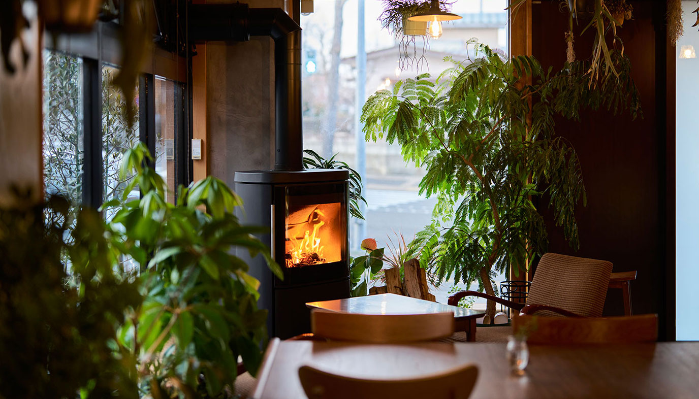 木や石、金属といった異なる素材を心地よくミックスして仕上げた店内は、小畑さんの好みが存分に反映されていて、清々しい空気を感じさせるたくさんの観葉植物や、コレクションされたレコードのBGMが心を和ませてくれます。その空間にあって存在感を放つのが、店内の一角に置かれたシンプルなデザインの薪ストーブ。デンマークのメーカーHWAM(ワム)の「4640m」です。