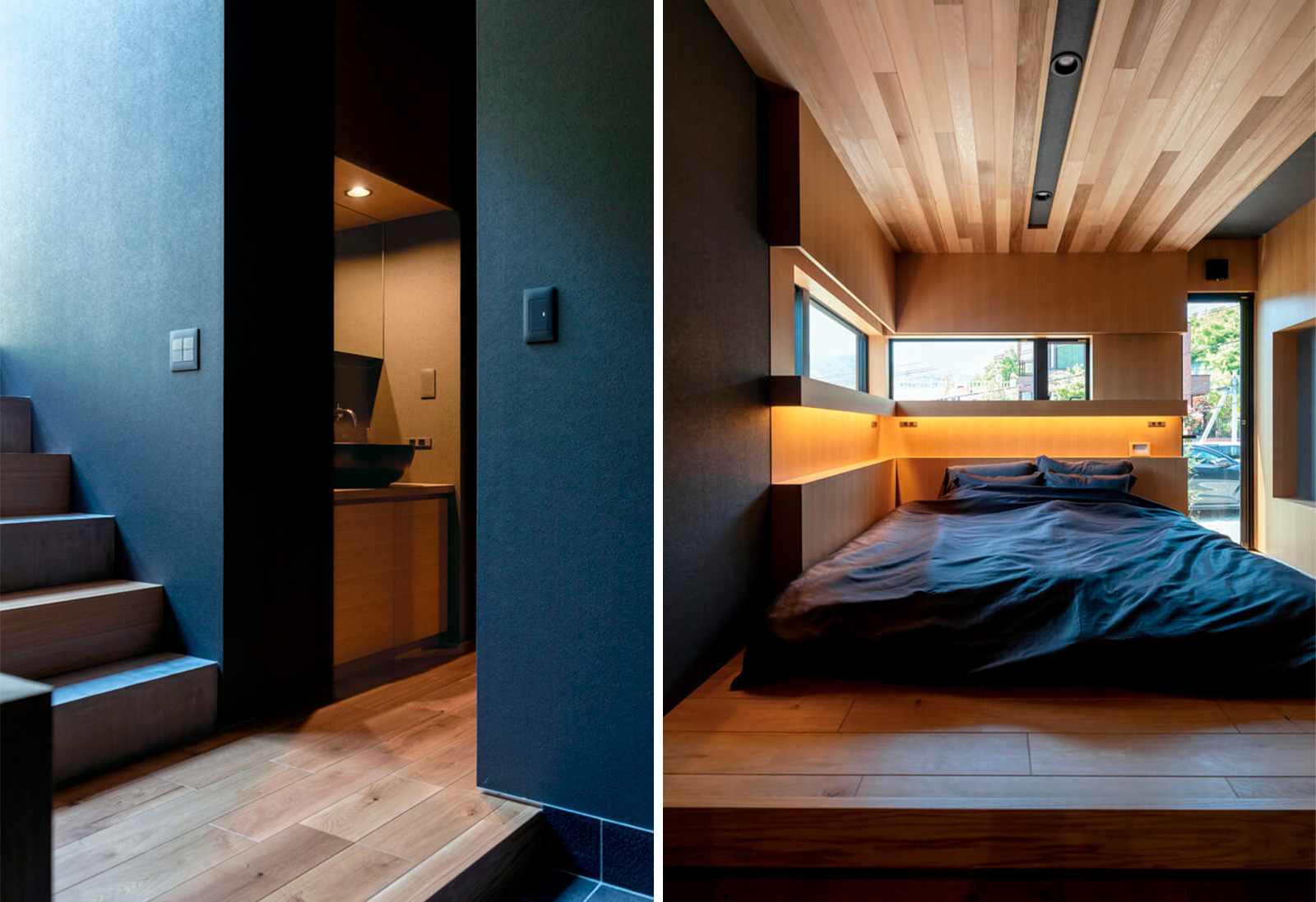 坂道を上った高台に立つ黒い箱のようなこの住まい。室内の壁もつや消しの黒一色で、洗面台や浴室もオールブラックでコーディネートした、大人な上質感にこだわった住まいです。