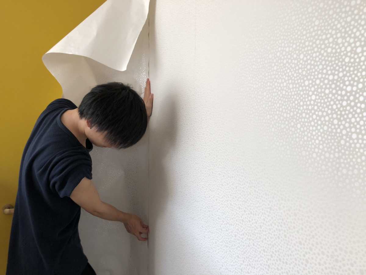 手順を間違えそうになったりして最初は少し戸惑いましたが、いろいろとアドバイスを受けながら、みんなで1枚ずつ壁紙を貼り、汚れていた壁がきれいに変わっていきました。