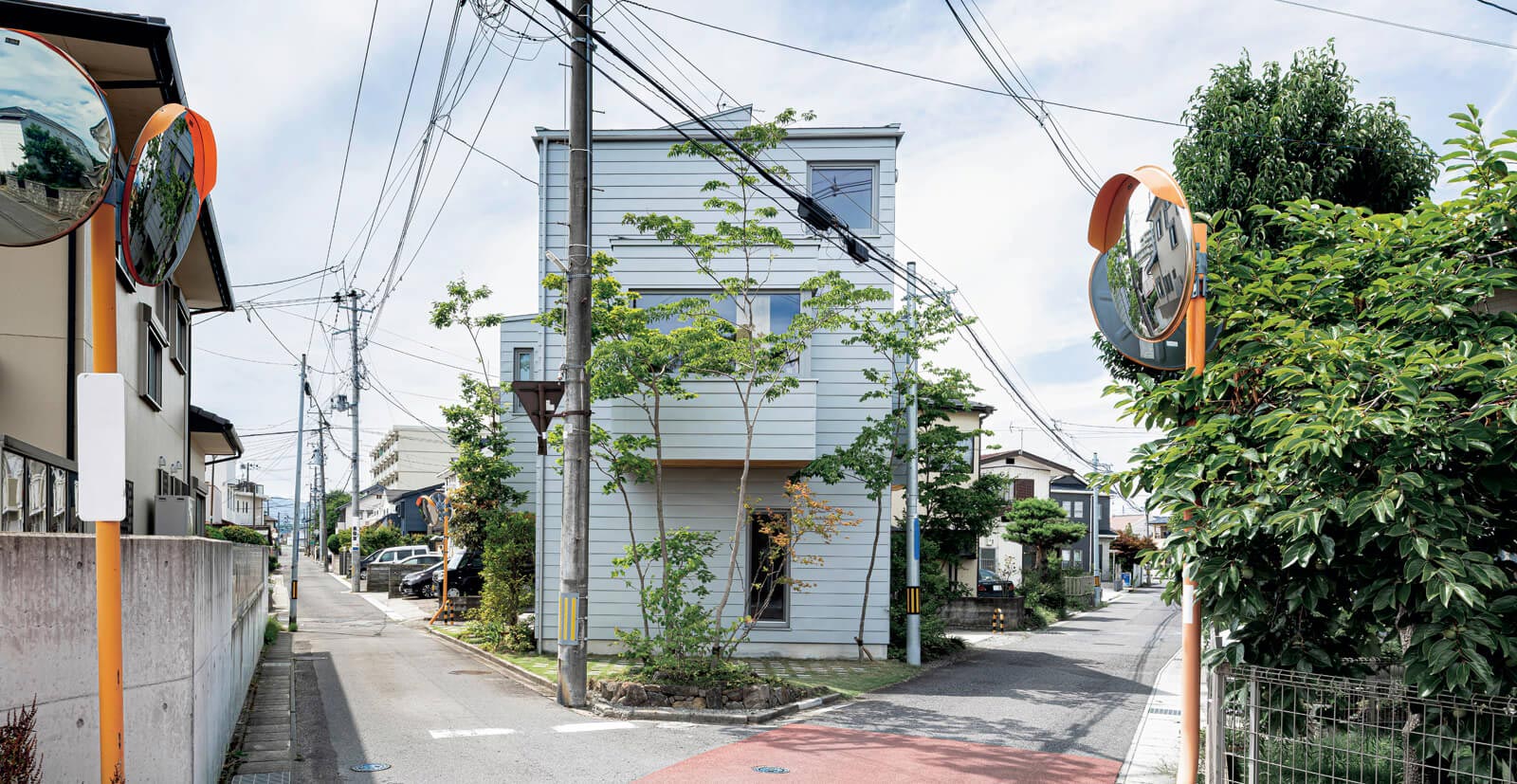 自邸の新築にあたり、私は二方が道路、もう一方が歩道に囲まれた小さな二等辺三角形の土地を選びました。いろいろな案を考えた末、敷地の中央に5.46m角の建物を据え置き、建物周囲にできた三角形の空地に植栽をしました。道路が周辺区画に対して斜めに通っているせいか、周りの住宅の多くも三角形の空地が残り、木々が植えられた通りは緑豊かです。