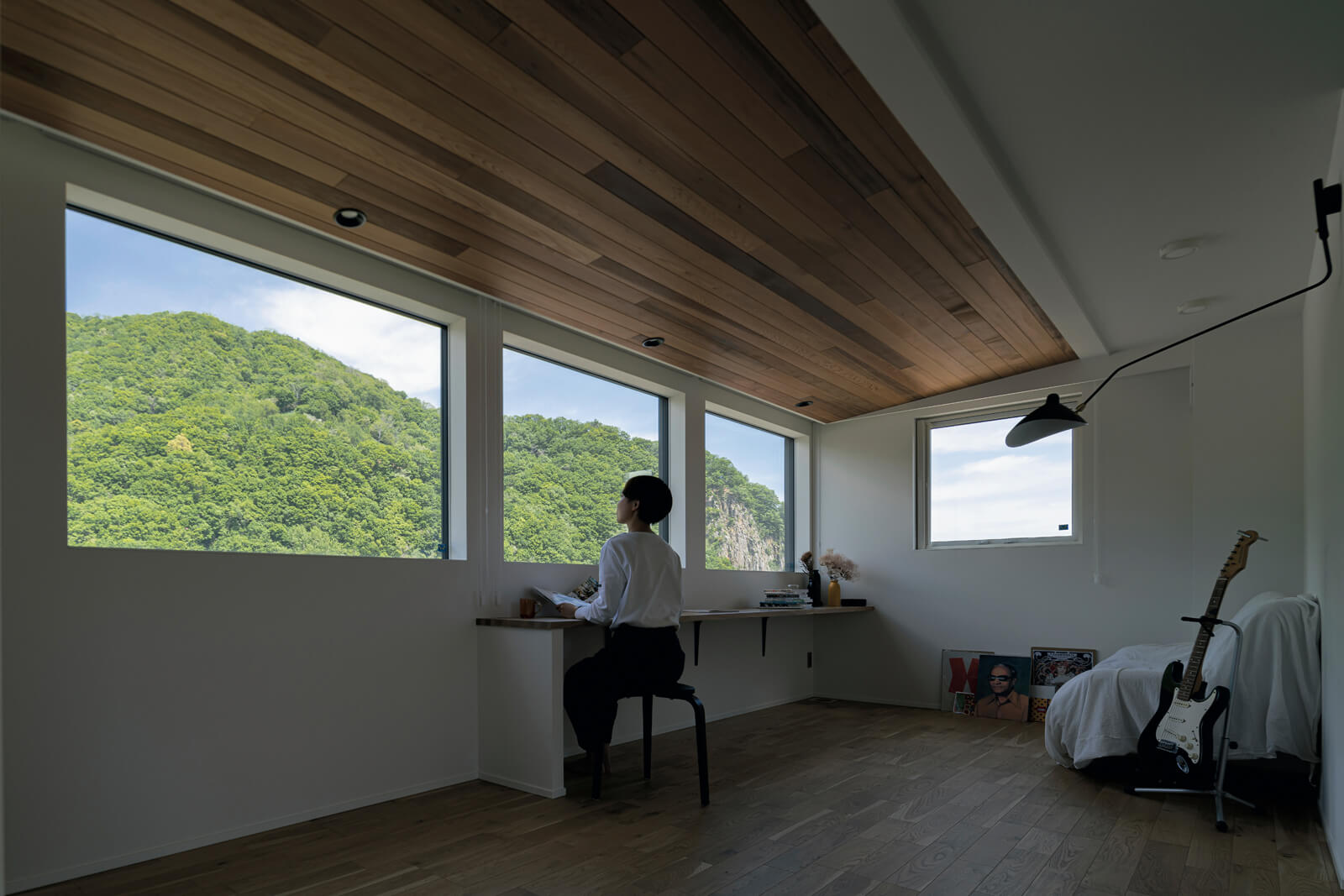 | 北に向かって下がる傾斜地に立つSさん宅。設計プランはその高低差のある形状を利用し、建物の強度を測る構造計算を実施しながら、遊び心ある空間に仕上げた。ずらして配置した2つの吹き抜けや変化のある天井高、緑や光を招き入れる大きな窓。とりわけ目を引く、北側の山並みがワイドスパンで迫る2階フリースペースの大開口は、高低差あっての設え。担当設計士が敷地に残っていた古家の2階からの眺望を確認し、プランに取り入れたという。立地と遊び心を生かした設計が、空間に心地よい広がりと豊かさをもたらした |