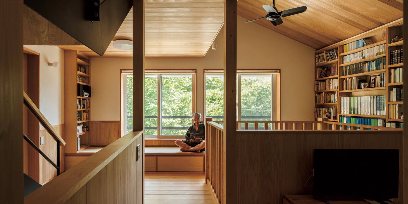 本好きなSさんの蔵書を収納するため壁一面に本棚を造作した小上がり仕様の2階リビング、奥さんが趣味の絵描きを嗜めるカウンターを一角に設えた1階のダイニング、景色を望みながらくつろげる階段脇の小上がりベンチや小屋裏など、住まいの各所にそれぞれの「居場所」が設けられています。「時間帯によっていろんな過ごし方ができるようになりました。近くに住む孫が遊びに来て、あちこちでお絵描きする様子を見るのも嬉しいです」と笑顔の奥さん。