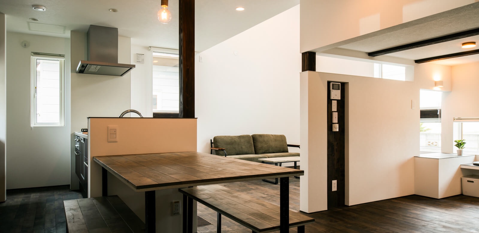 このモデルハウスは、30代の共働き夫婦と2人の子どもが暮らす住まいをイメージして設計。1階に水まわりとLDKを中心とした家族の憩いエリア、吹き抜けでつながる2階は寝室と子ども部屋、書斎コーナーなどを配したプライベートエリアに分かれています。構造に道産カラマツ、床にはカバやナラの無垢材を採用。白とダークブラウンを基調にしたシンプルな内装が、無垢材の質感を引き立て、落ち着いた雰囲気を漂わせています。