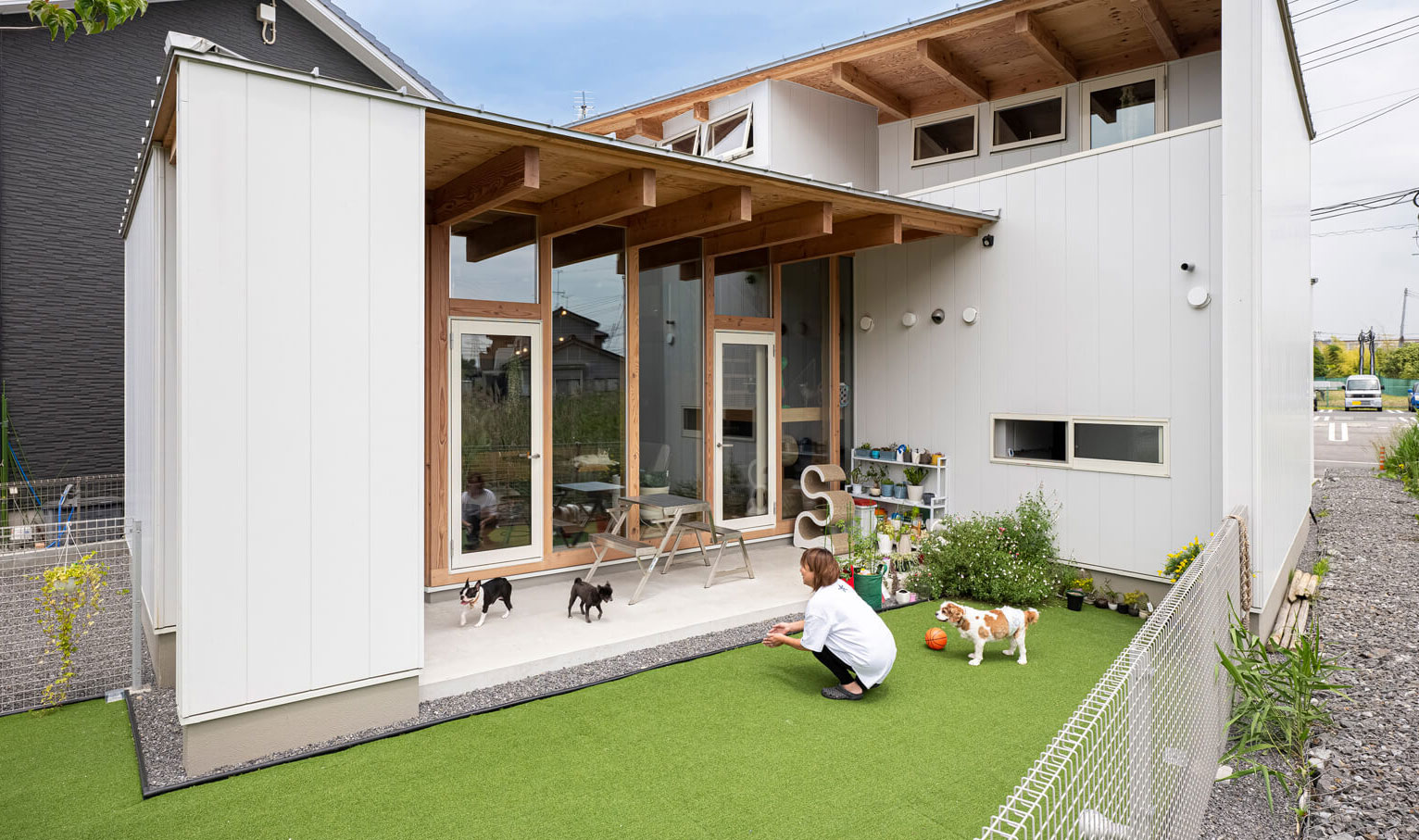 水田や森などの豊かな自然が残るいわき市の人気エリアの一角に、家族とペットがお互いに心地よく共存できる空間を追求した住宅があります。 室内からは青々とした緑が一望でき、ゆとりの広さのドッグランでは 愛犬たちが安心して自由に走り回れる…。