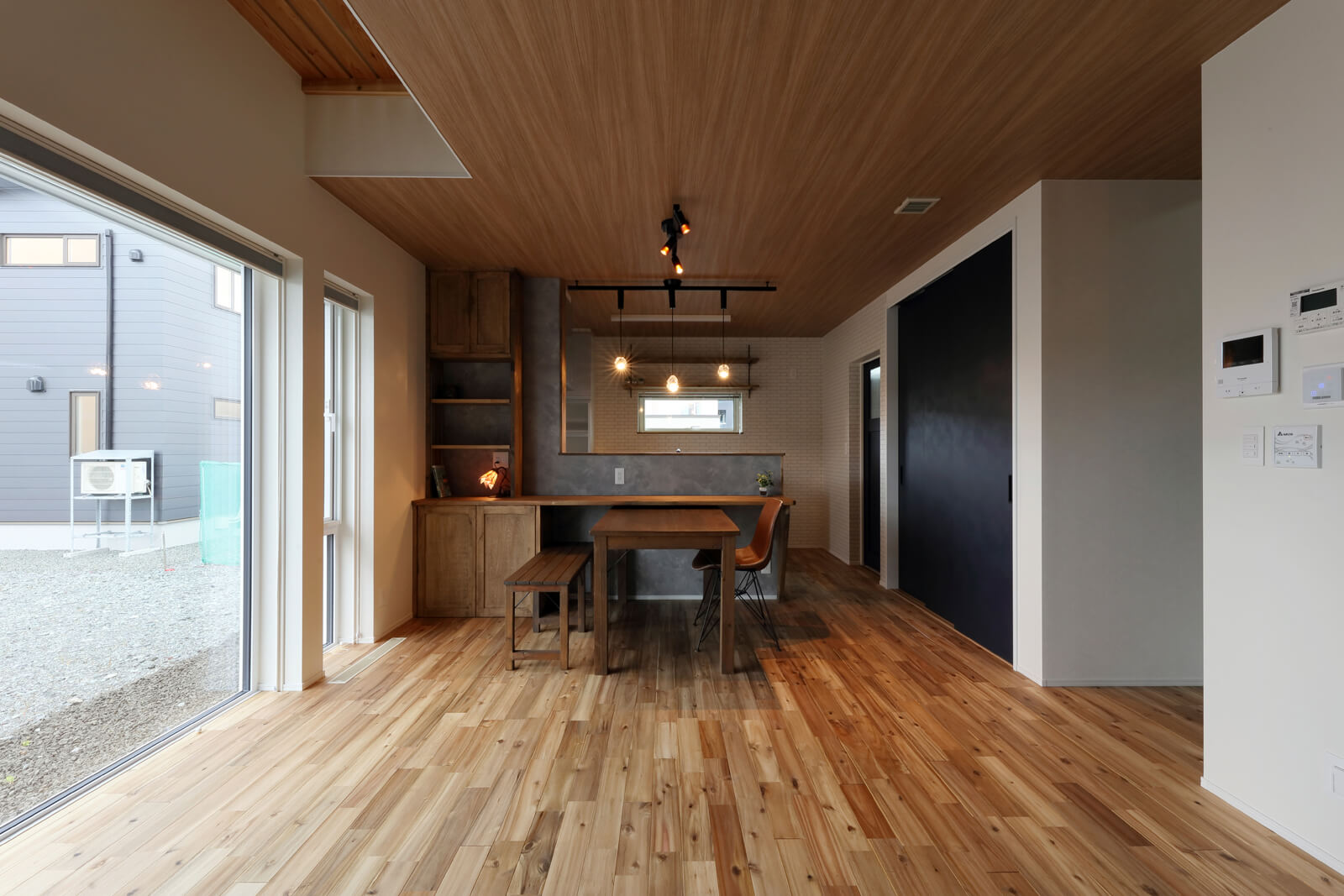 内装はややトーンを落とした落ち着きあふれる佇まい。1階の床に贅沢に用いられたアカシアの無垢材は、見た目の上質感はもちろん、足触りの心地よさや温もりも大きな魅力です。キッチンカウンターやテレビボードをはじめとするアカマツの集成材を使った造作もまた、室内にさらなる上質感をプラスしています。