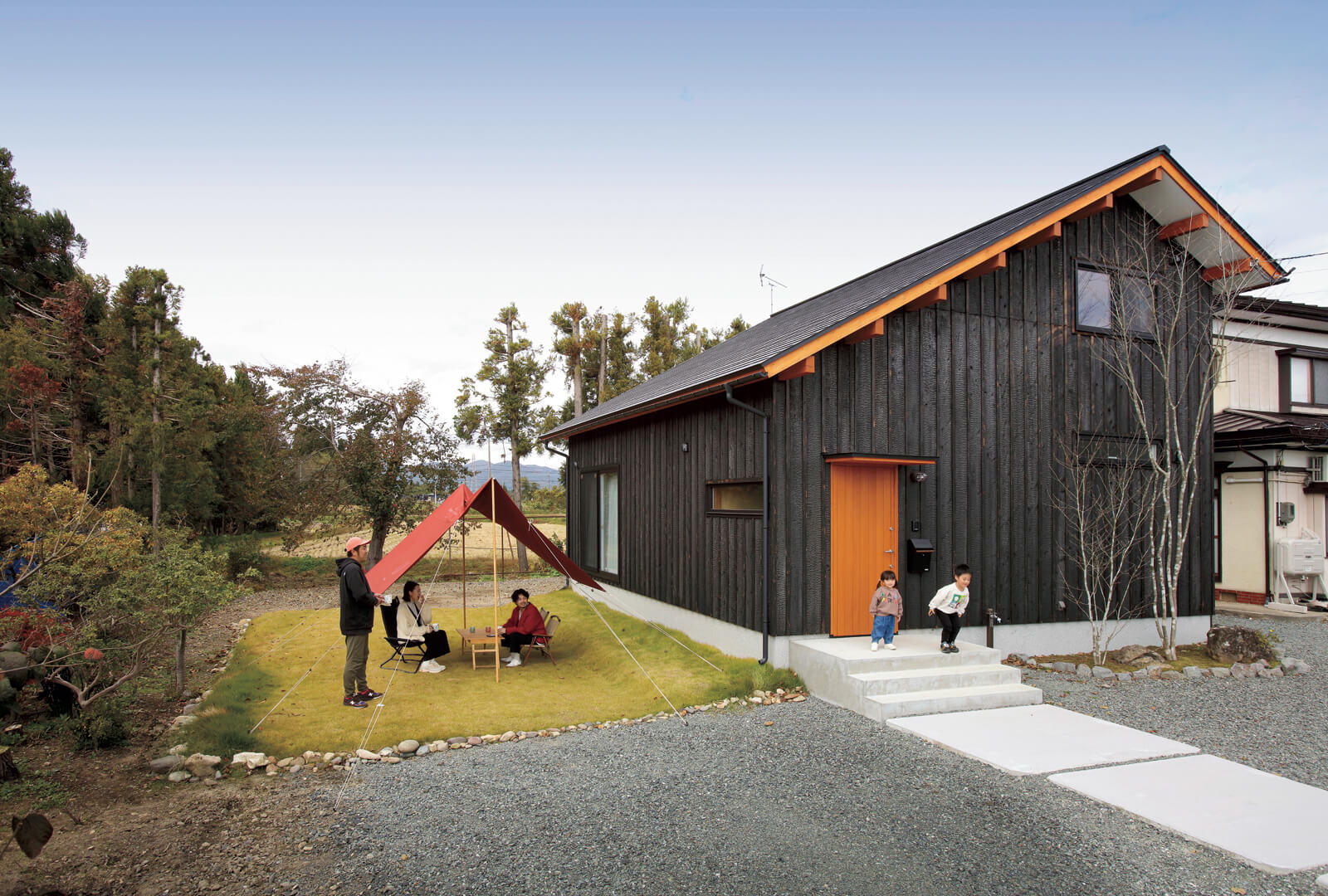 吹き抜けになった開放的なリビング、家事がしやすくなる横並びのダイニング・キッチン、洋服屋さんのようなオープンクローゼット、旅館をイメージして造作した広い洗面台、子どもたちが家中を走り回れる大空間など、斎藤兆伸代表はご夫妻の要望を一つひとつ具現化。さらに自社で焼いてつくる焼杉の外壁や造作収納など、自社大工による匠の技を活かし、かっこよくて住み心地のよい家をつくり上げました。