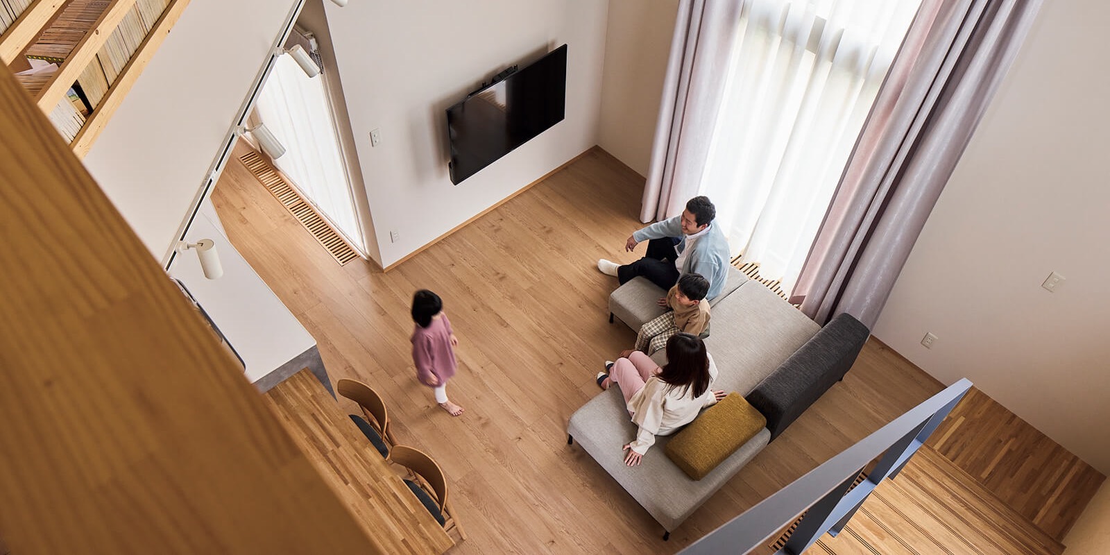 「収納の充実で、LDKはいつもすっきり保つことができています。おかげで家の中でくつろぐ時間もできました」と笑顔で話す奥さん。新居にはにぎやかな子どもたちの声と、夫婦のくつろぎの時間が流れています。