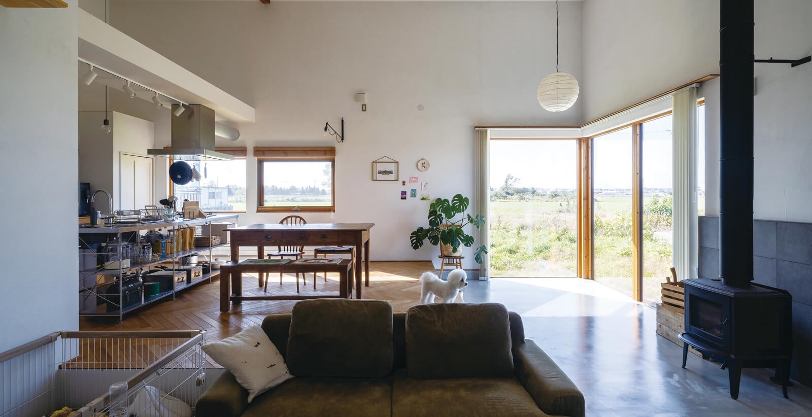 長沼の田園風景を取り込む薪ストーブと土間のある自然素材の平屋住宅