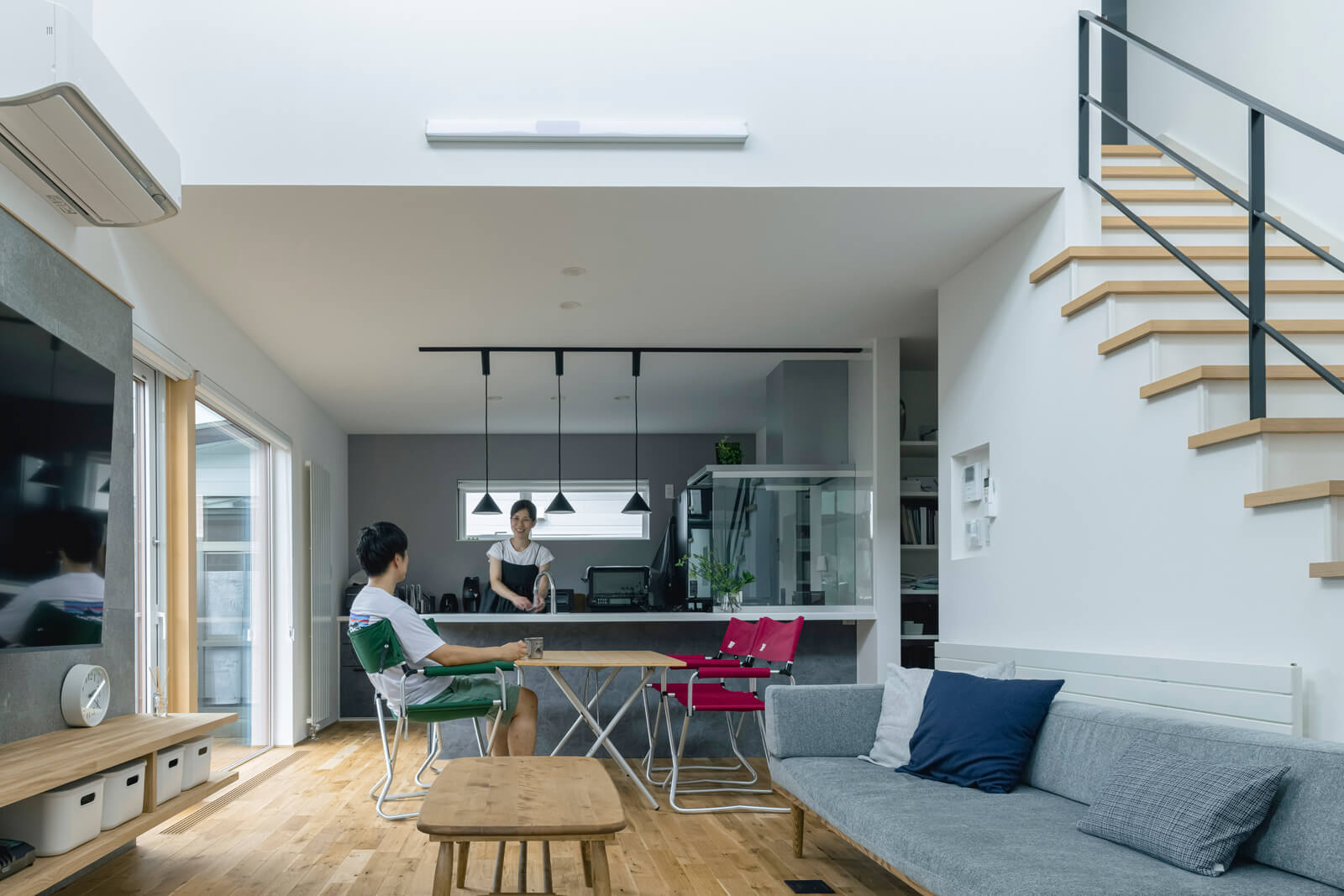 キッチンから望むリビングは、採光窓を設けた吹き抜けが心地よい開放感を演出。2人の子どもたちも、リビングに自然と集うことが多くなりました。「生まれて初めて、自分の部屋ができたのにね」と、奥さんは笑います。