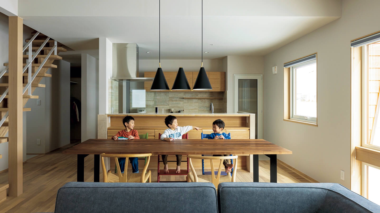 社宅住まいだったIさんご夫妻は長年、冬の寒さ・夏の暑さと、カビや結露で悩まされてきました。双子の息子さんが誕生したのを機に、新築を決意。住宅展示場を訪ね、家づくりのパートナーを探していたときに、リプランで見たアクト建築工房の住まいに目が留まりました。「大手とはひと味違う、北欧テイストの自然な雰囲気の内装がとても気に入り、ここなら私たちらしくて、快適な住まいをつくってもらえると思いました」と奥さん。