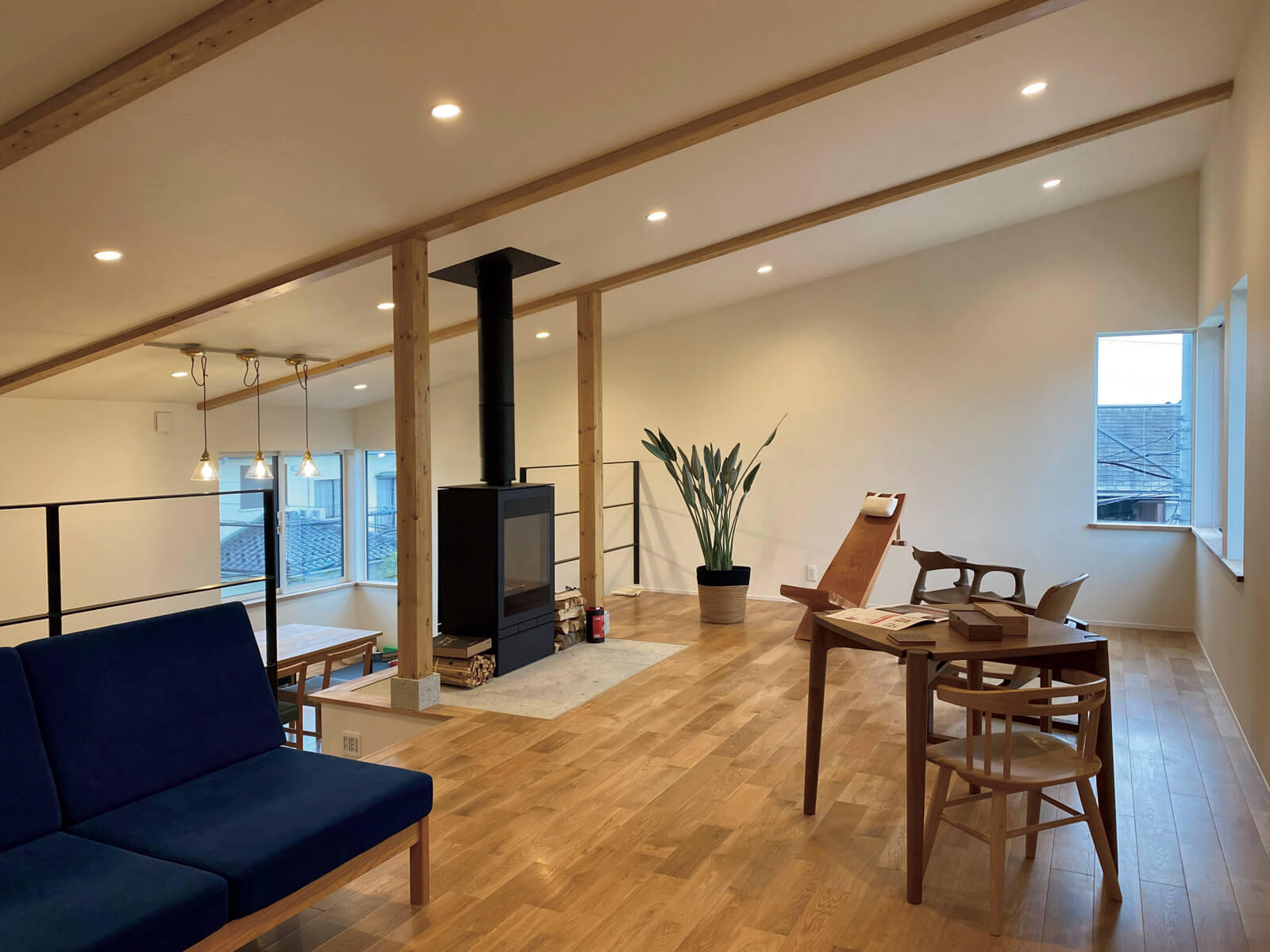 スキップフロアの構成とし、1階エントランスと個室フロアから、収納フロア、ダイニング・キッチン、月山を眺望できるリビングへと上がっていく流れをつくりました。ダイニング・キッチンとリビングはスキップしているものの一つの空間で、その中心に両側ガラスの薪ストーブを設置。スキップフロアを活かして、ダイニングテーブルからも椅子に座った目線で炎を眺めることができます。