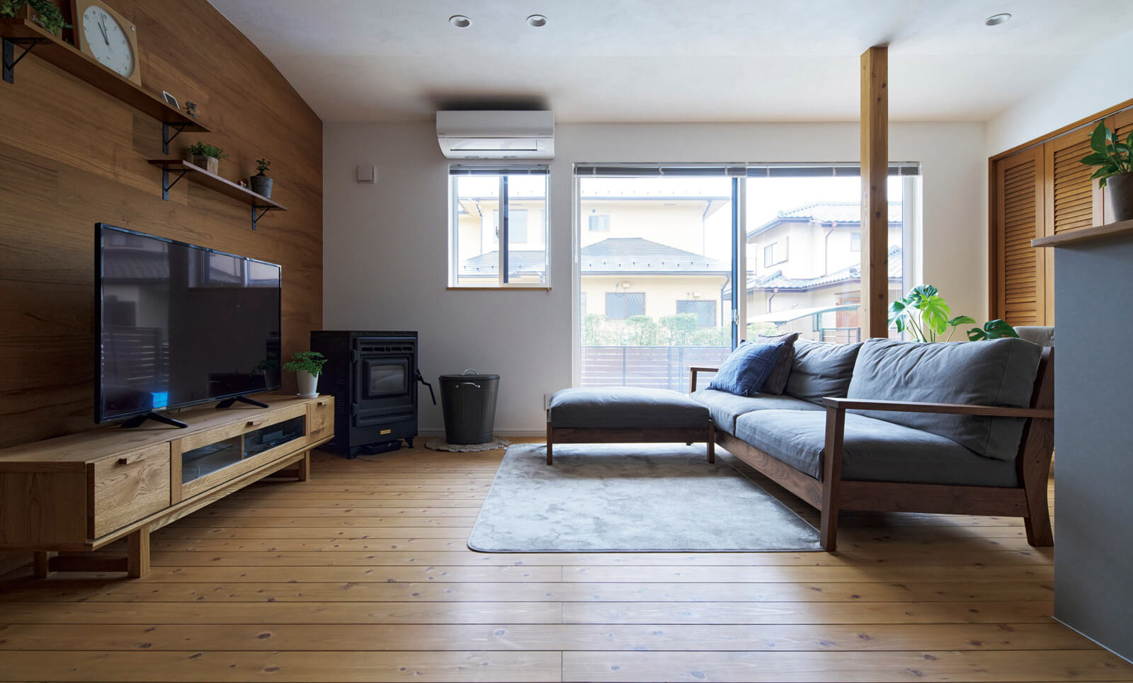 リビングに置いたペレットストーブの温風は、吹き抜けを通して2階にある娘さんやTさんの部屋まで行き渡ります。北海道レベルの高断熱仕様にご夫妻は「真冬でもペレットストーブと補助的なエアコンだけで、家全体が暖かく快適。漆喰の調湿効果で、マンション暮らしで悩まされていた結露もありません」と、笑顔を見せます。