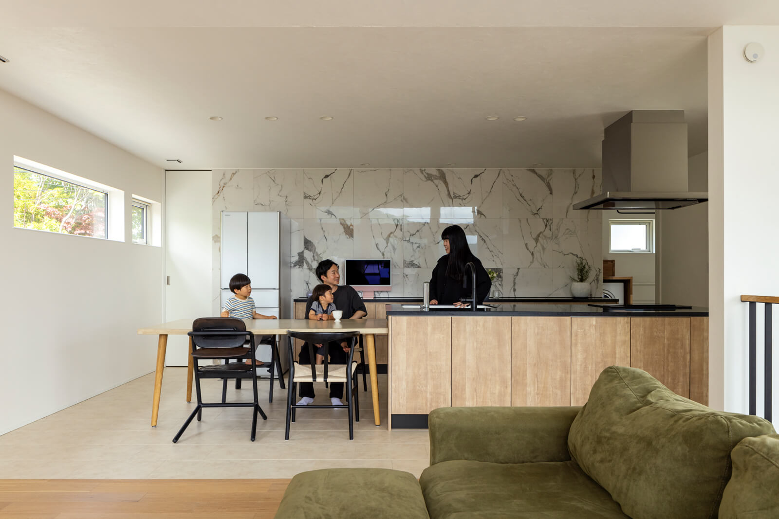 2022年のクリスマスイブに新居が完成。ご一家にとって忘れられない大きなクリスマスの贈り物となりました。ご夫妻のお気に入りは、立地を生かして2階に設けた明るく開放的なLDK。「特にキッチンは素材や設備、広さにこだわり抜いたかいあって、とても使いやすいです。キッチンから見渡す景色は、毎日眺めていても飽きません」と、奥さんはにっこり。