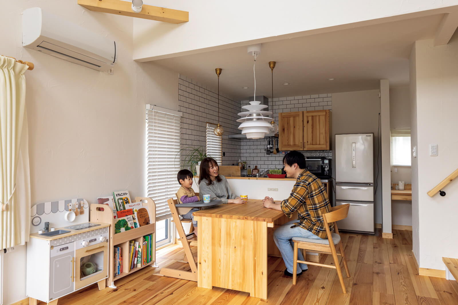 パイン材の床は、直に座っても暖か。また安全性の高い自然派塗料「オスモカラー」で仕上げられているので、床で遊ぶ小さな子どもにも安心です。「子どもが小さいうちから本物の木に触れることも、良い経験になります。願いどおり、温かく優しい雰囲気に仕上がり、暮らしやすい住まいになって、気持ちにも余裕が生まれました」と、奥さんは声を弾ませて話してくれました。