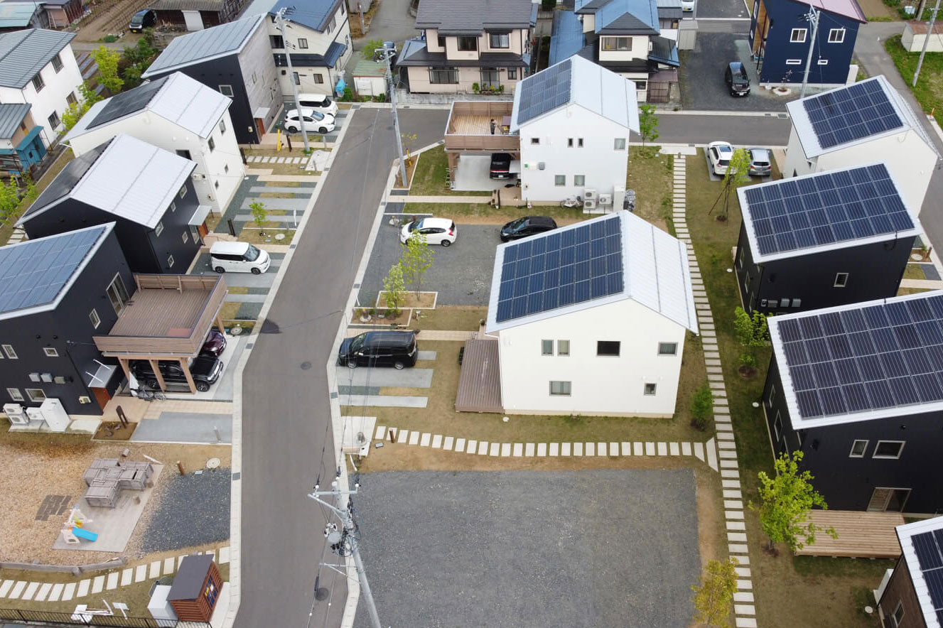 このまちの住宅は「吹き抜けのある家」、「土間のある家」、「デッキテラスのある家」という3つの基本プランから一つを選んだもので、すべてが北海道基準並みの断熱性能を有する高性能住宅。全戸に大容量の太陽光発電システムを標準搭載した「エコで省エネな暮らしが叶う住まい」となっています。